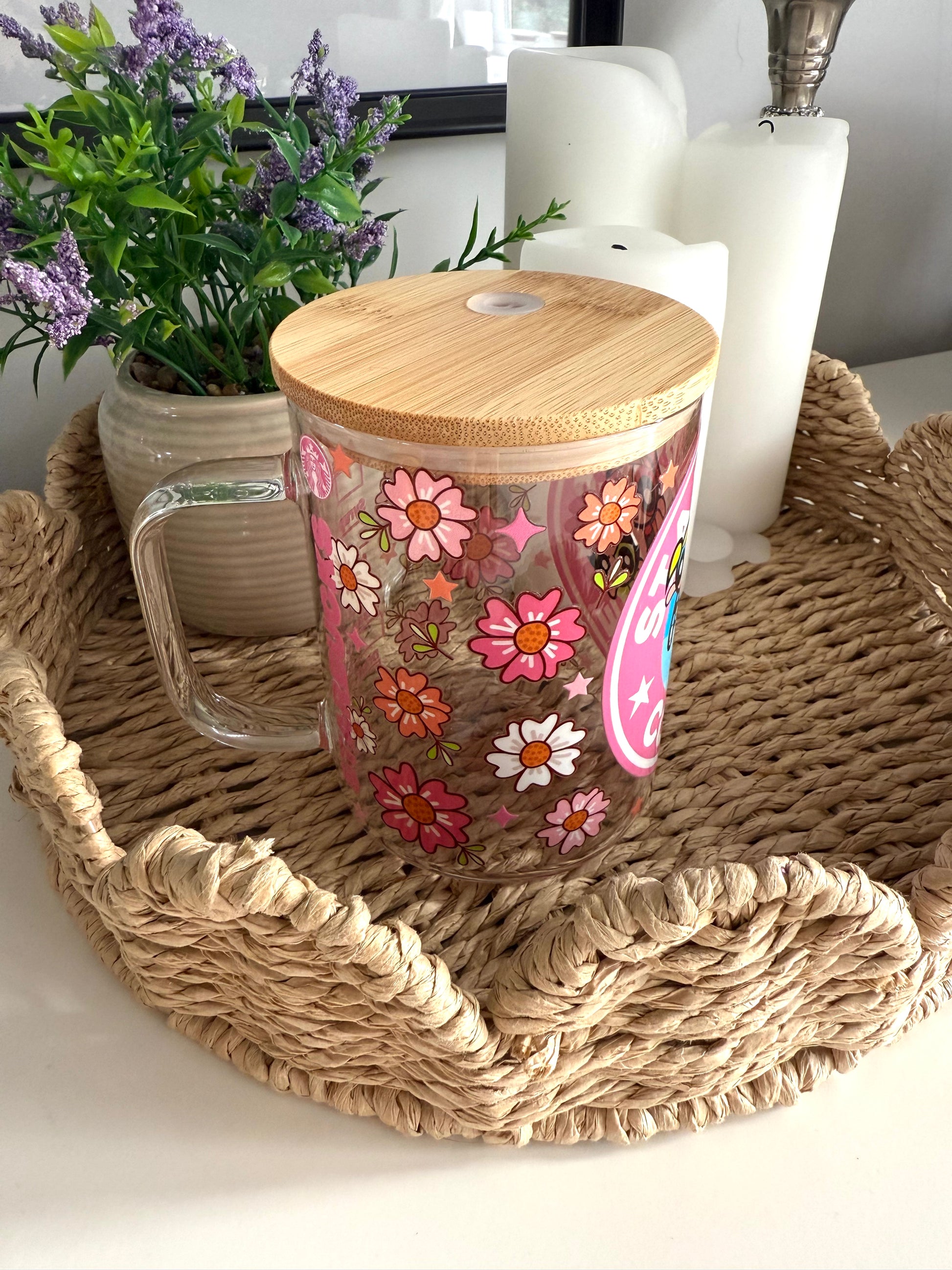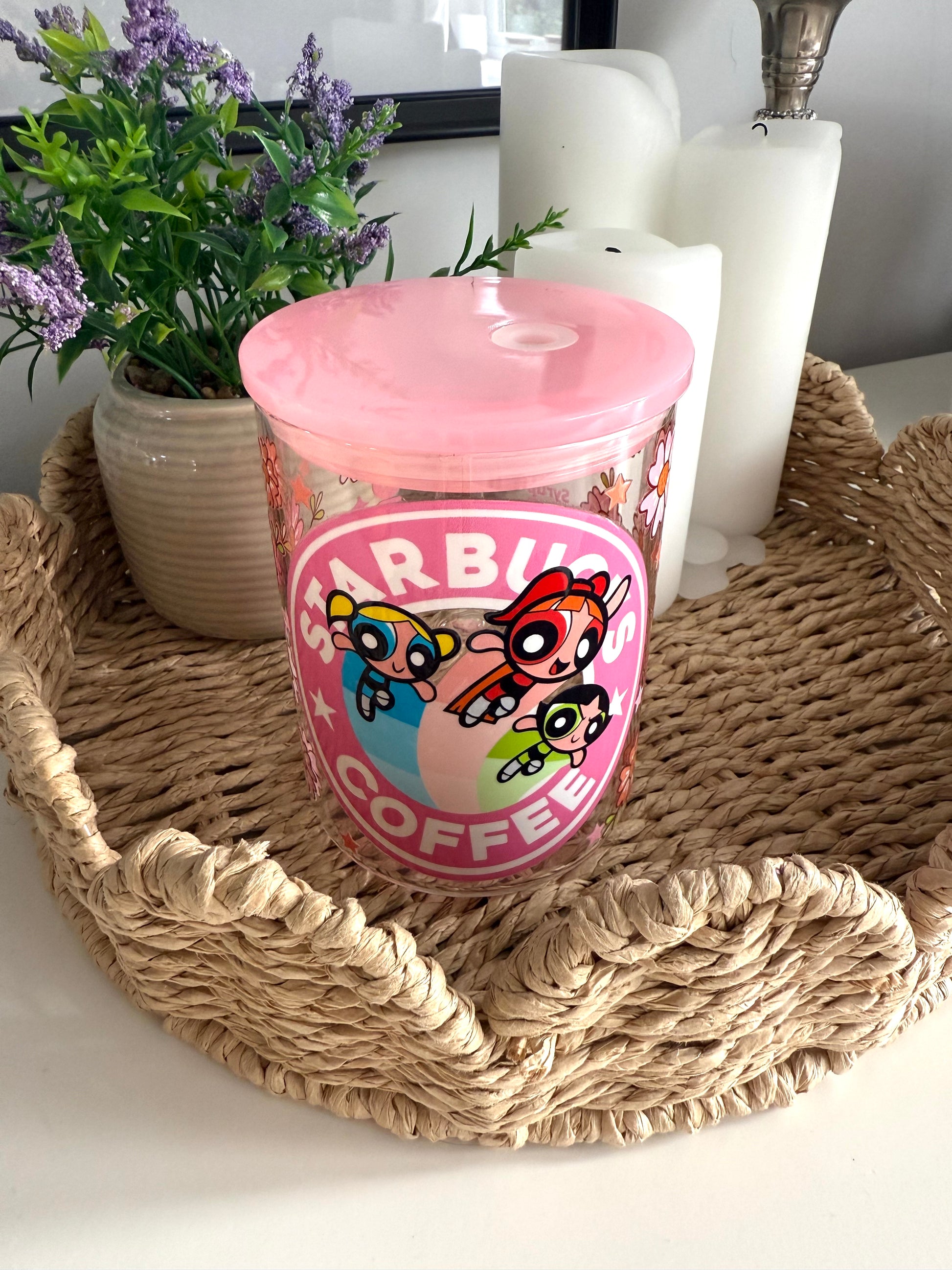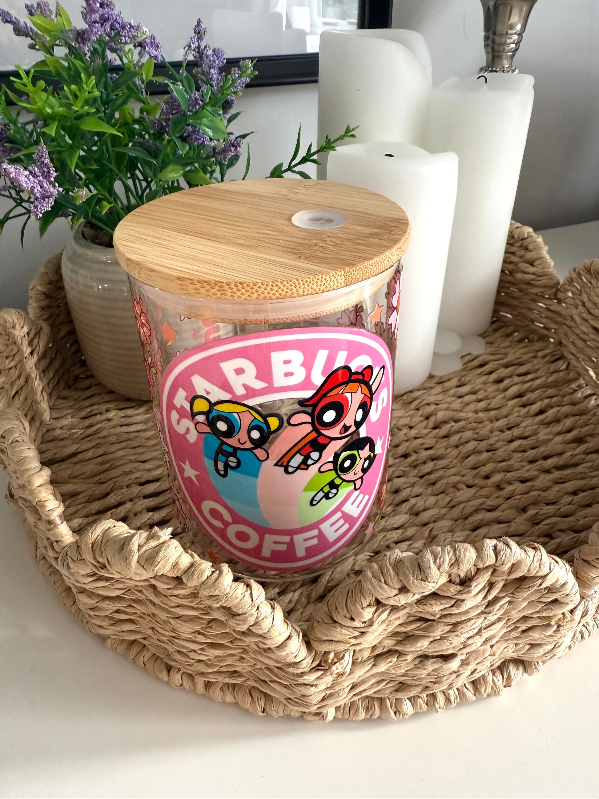 The Powerpuff Girls glass mug is a fun and nostalgic throwback, featuring Blossom, Bubbles, and Buttercup inside a bold pink coffee shop logo design. Perfect for enjoying your favorite drinks while adding a splash of cartoon magic to your day.