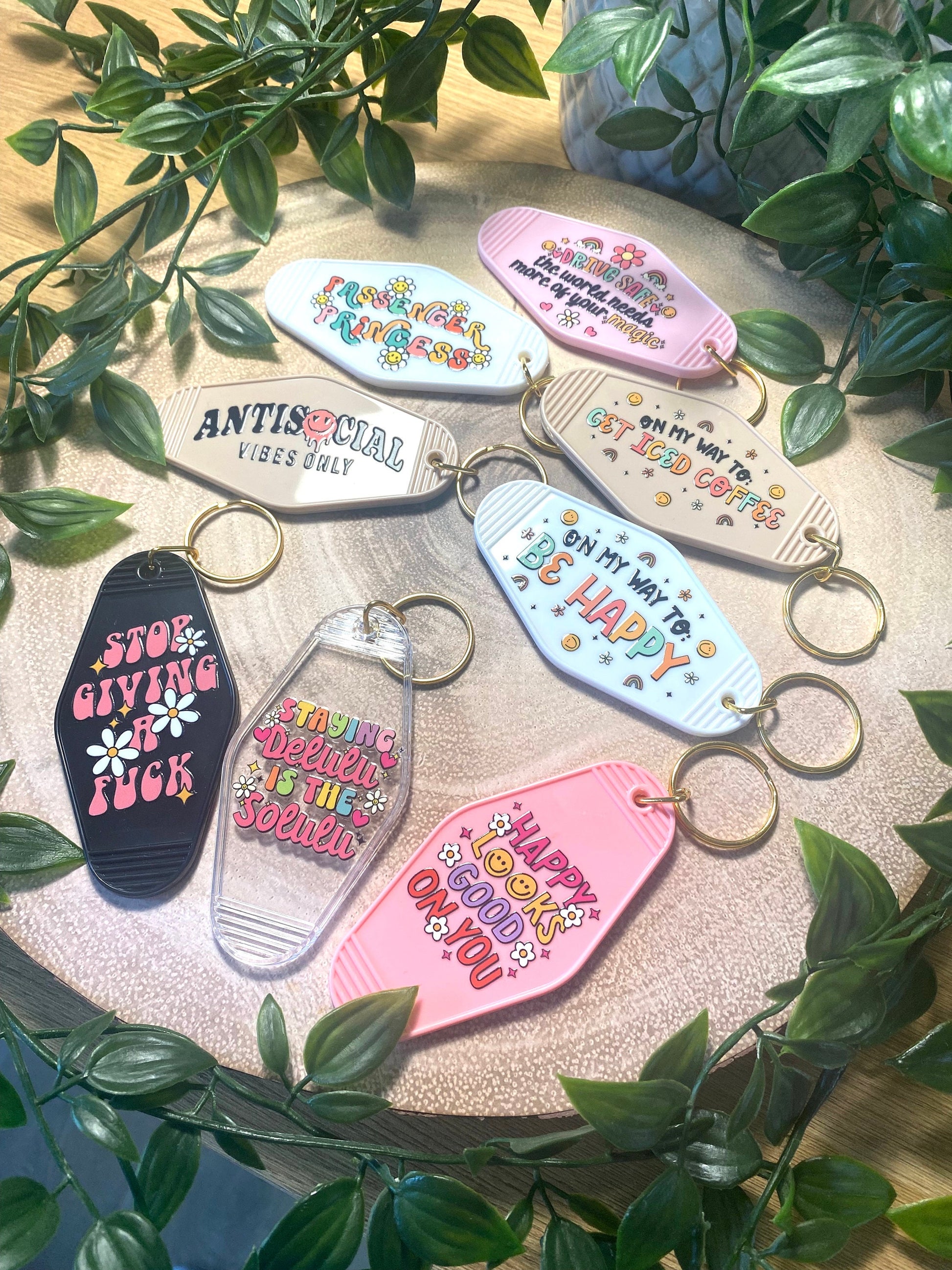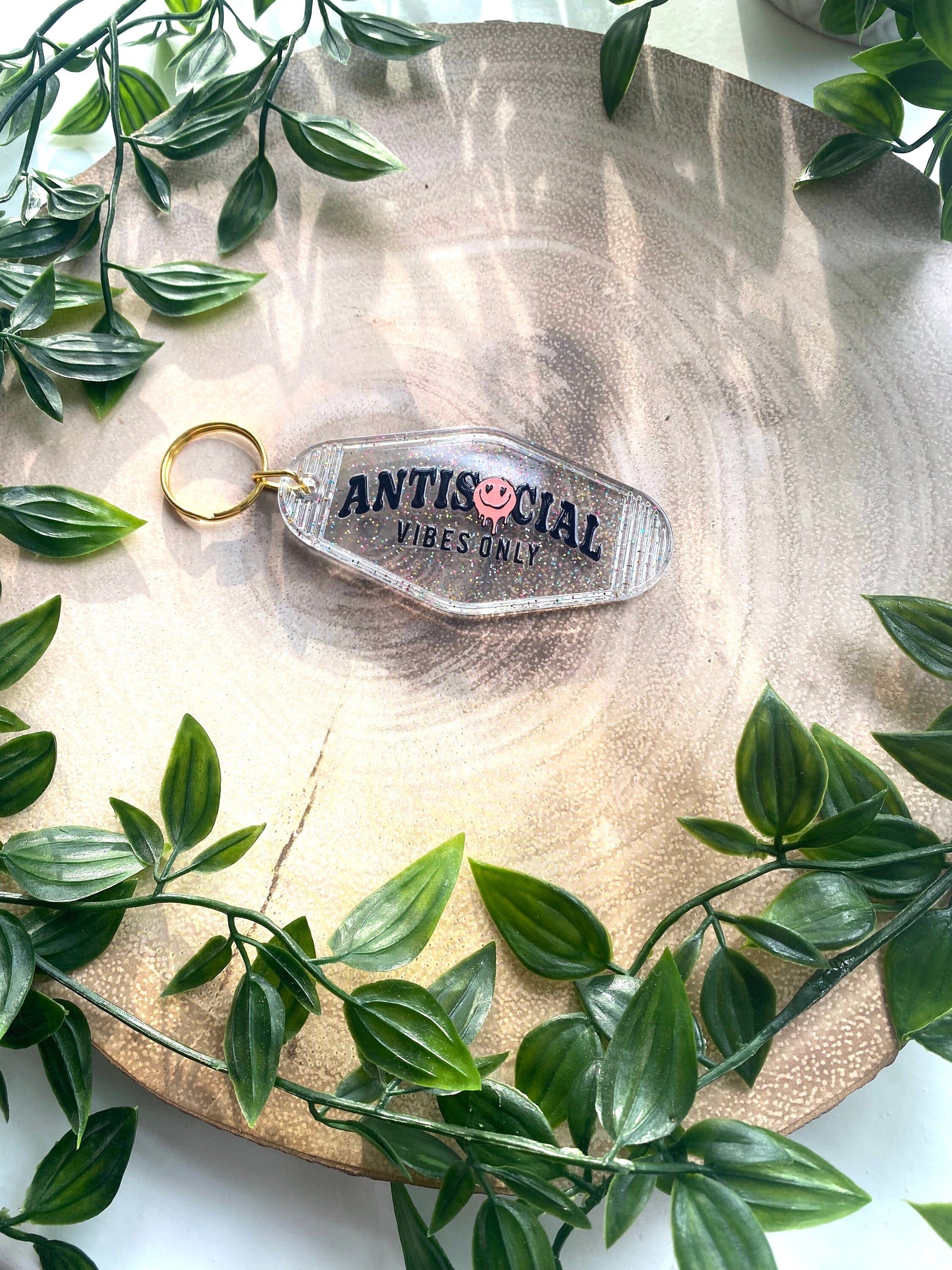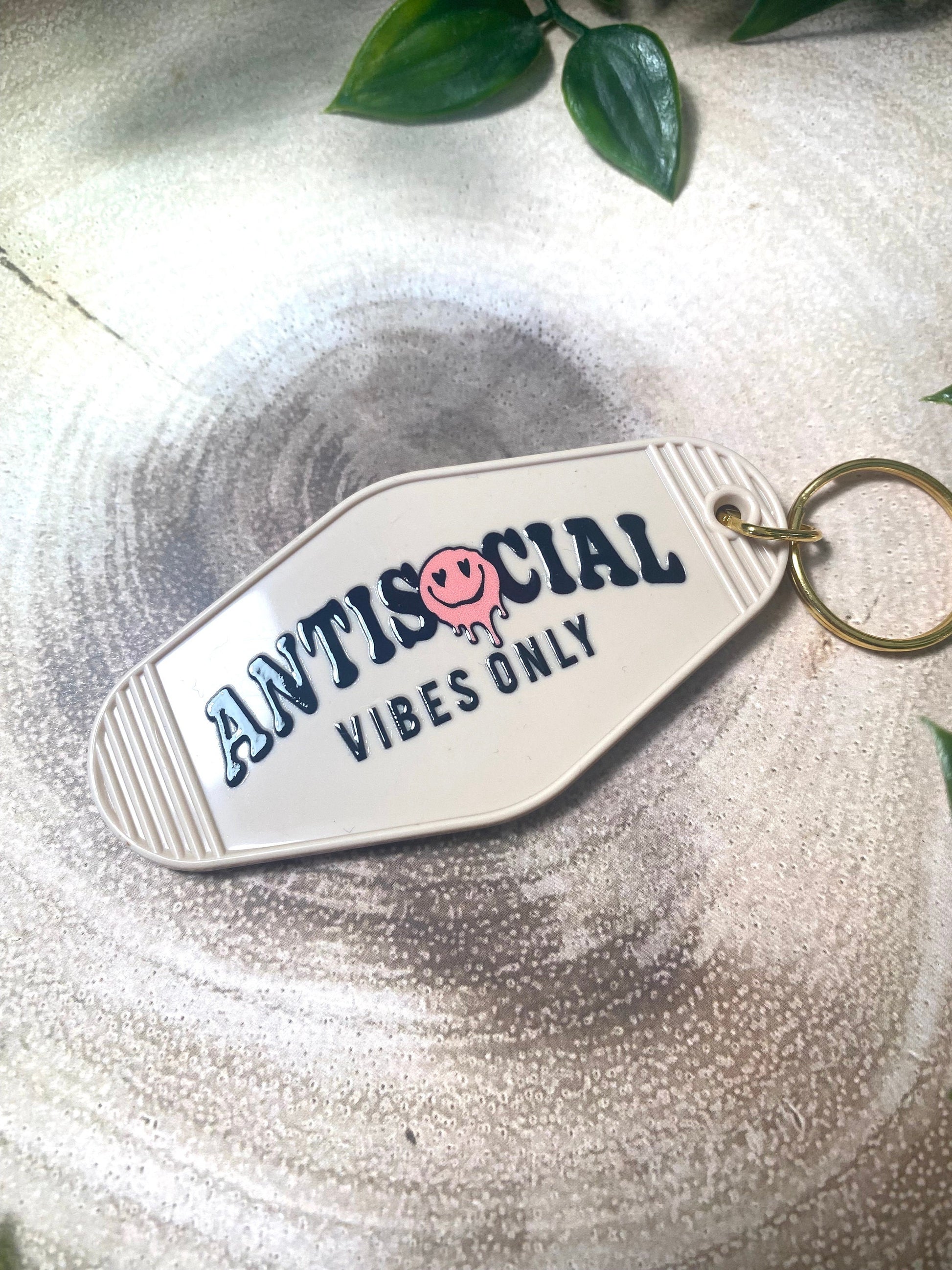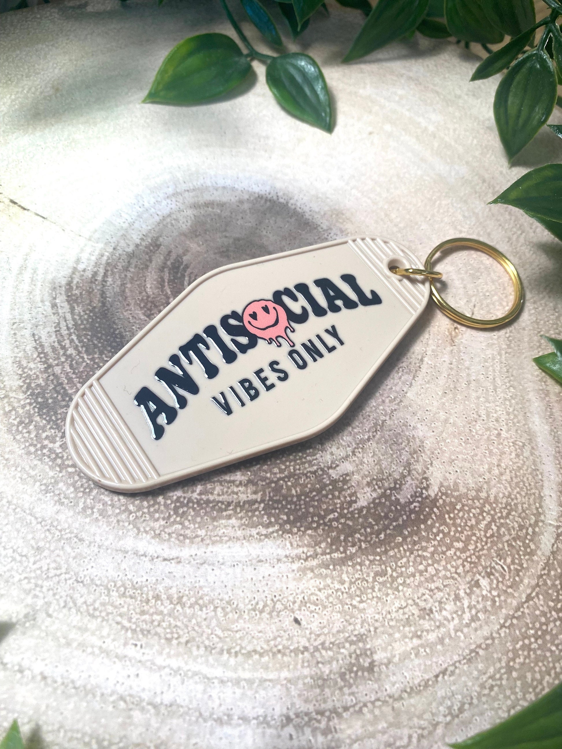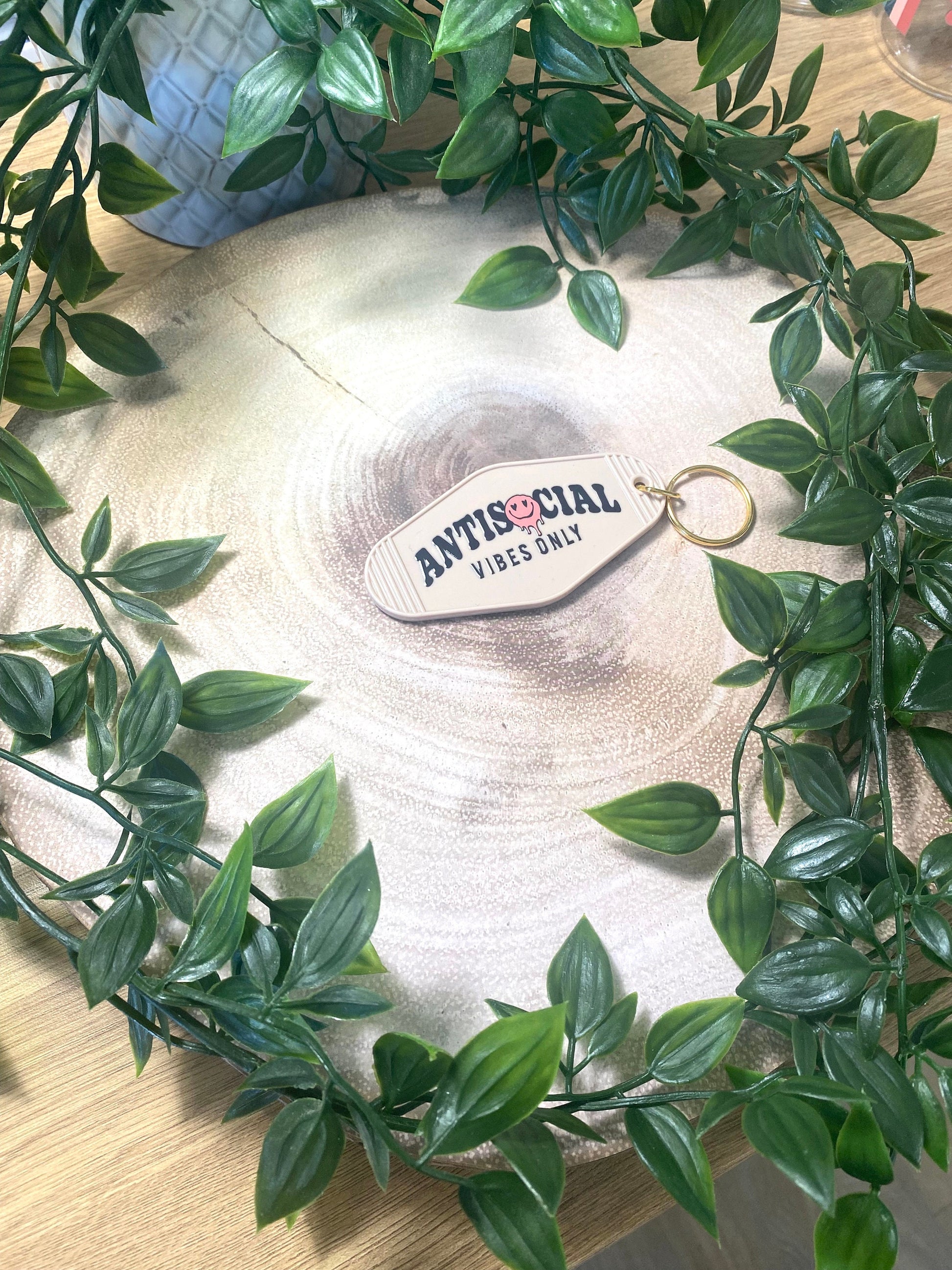 Make your boundaries clear and your style loud with this Antisocial Vibes Only retro motel-style keyring. With bold black lettering, a splash of pink, and a cheeky smiley face, this keyring is perfect for those who value their space (and their aesthetic).