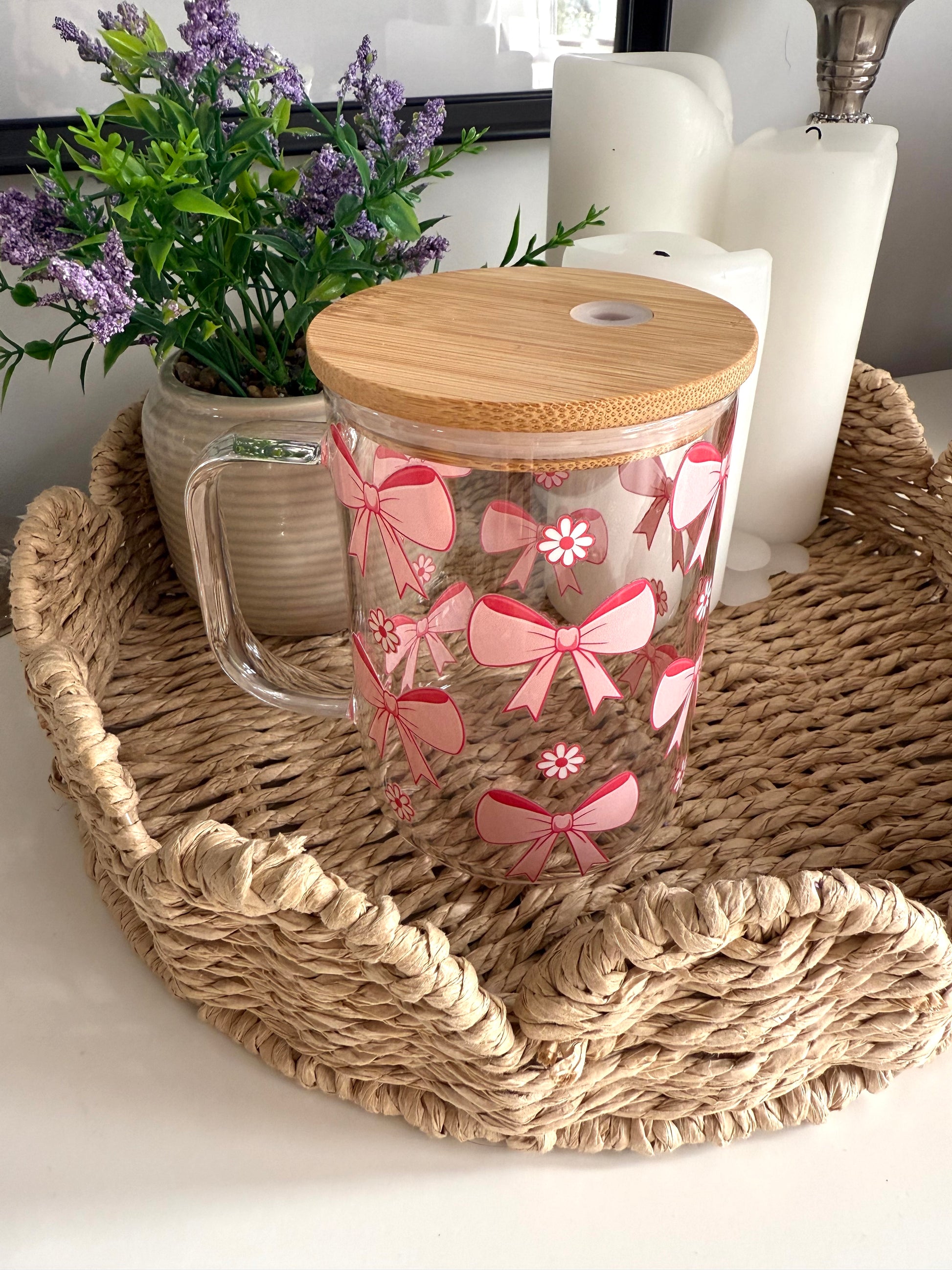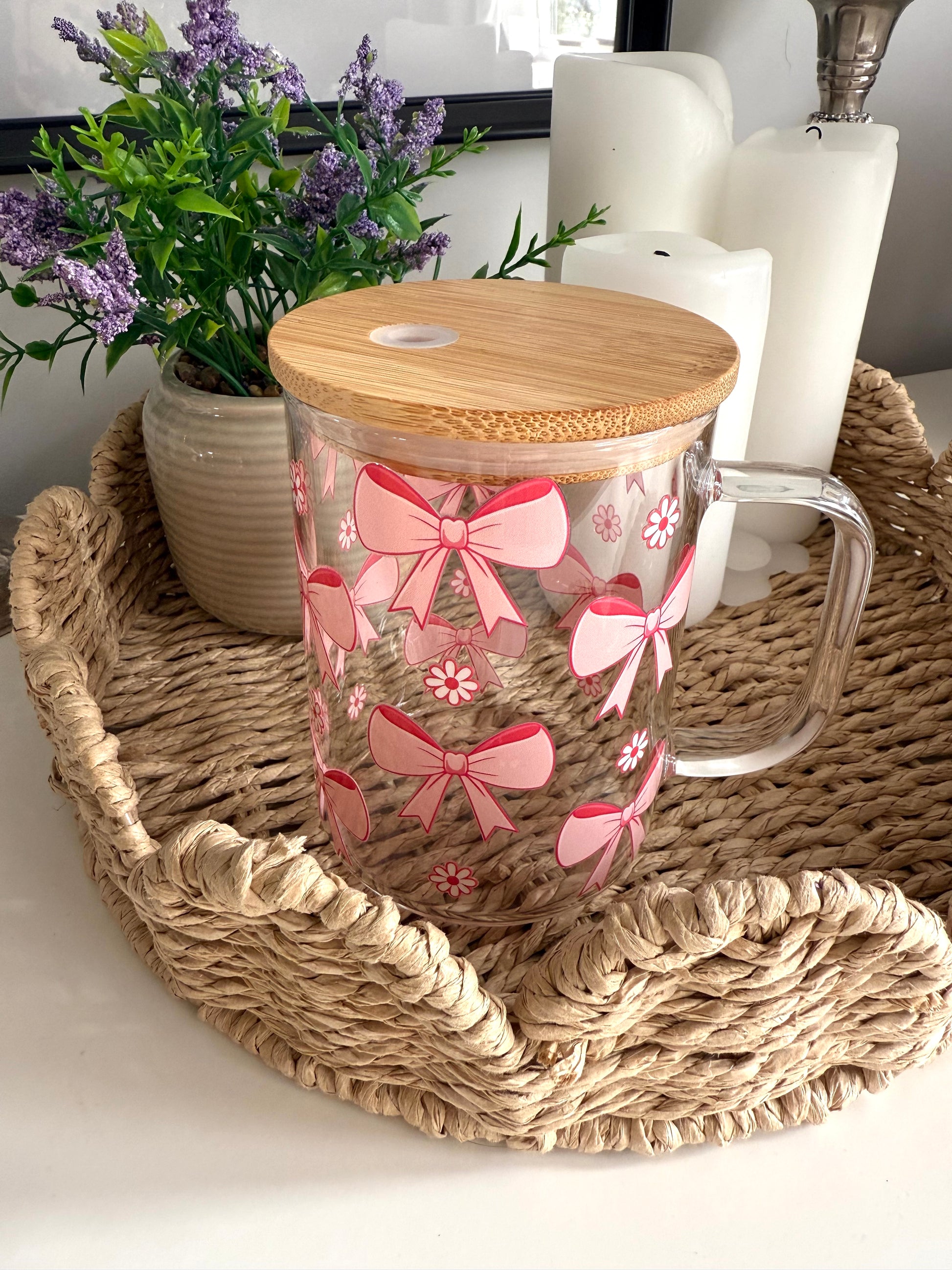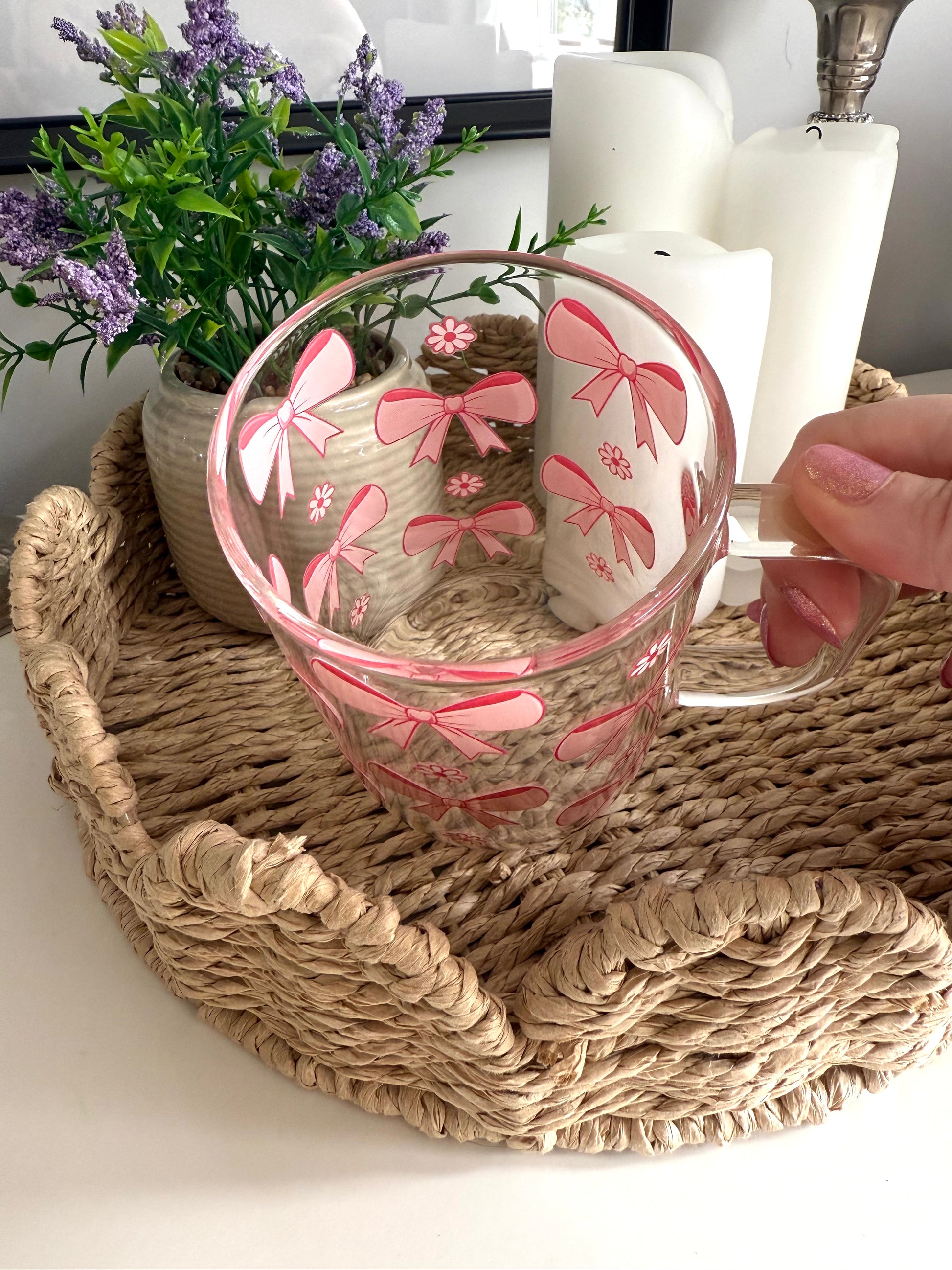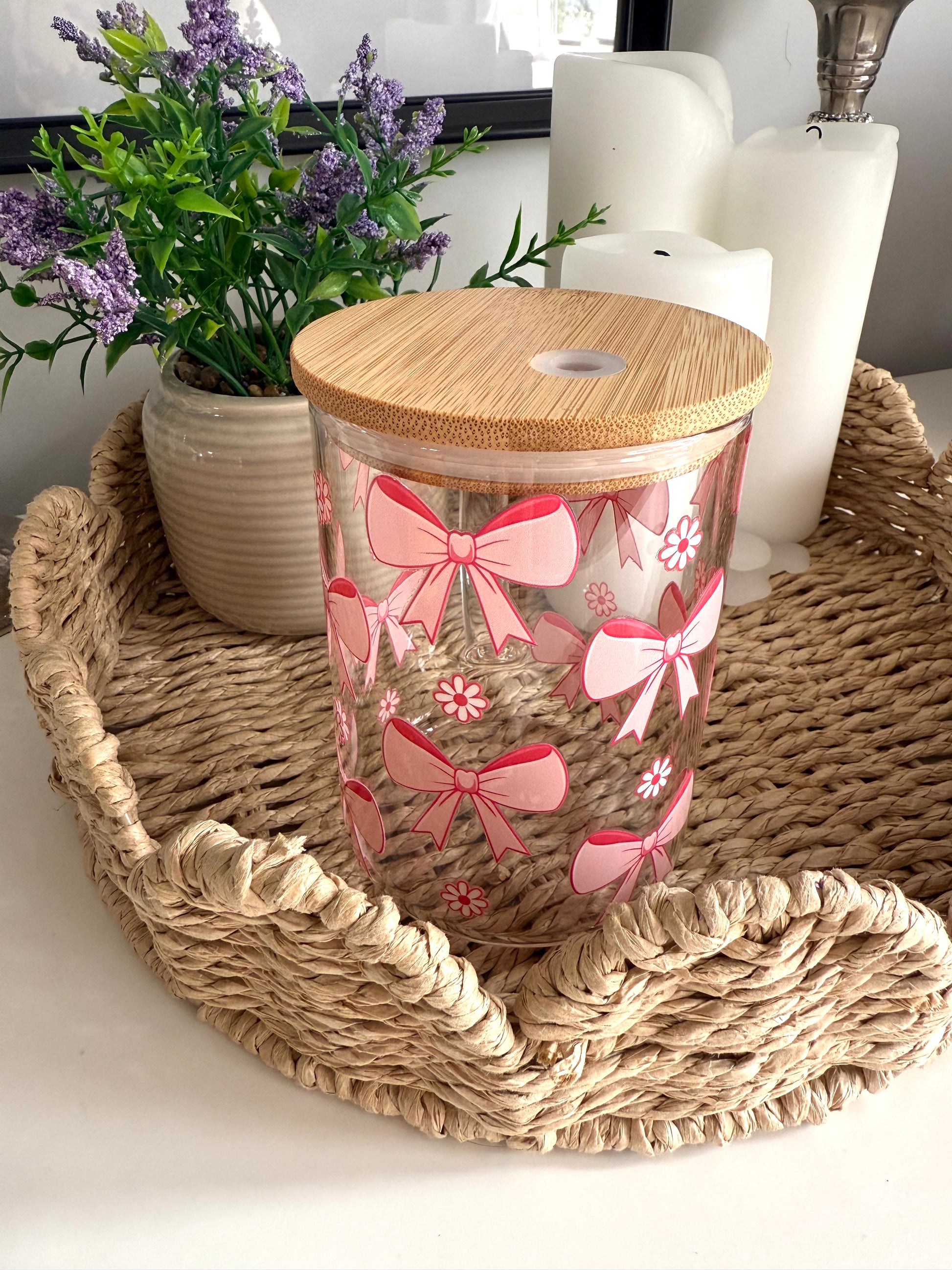 The Blush Bow Dream Glass Cup is adorned with dainty pastel bows and tiny flowers, creating a sweet and feminine design that’s perfect for your daily drinks. Its charming style makes every sip feel extra special.