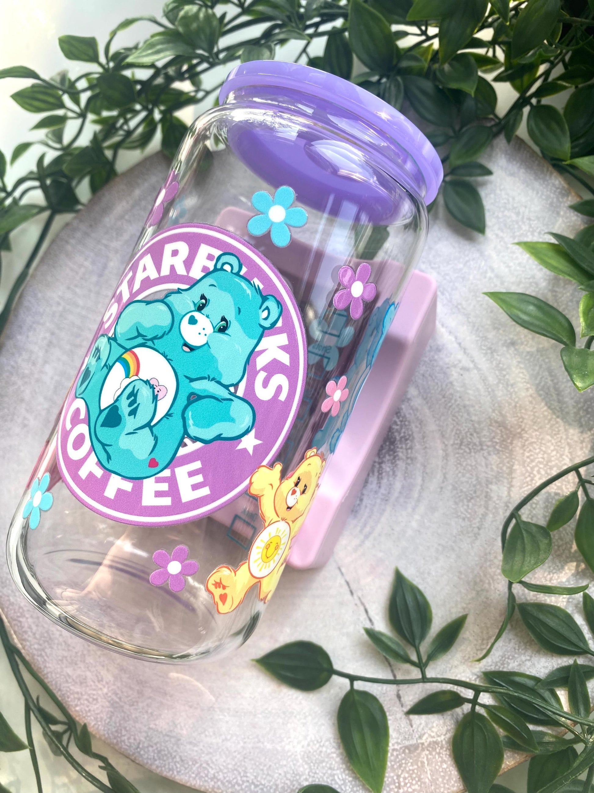 The Care Bear Daisy Delight Glass Cup blends nostalgic cuteness with coffee shop vibes, featuring a cheerful teal Care Bear holding a rainbow against a playful Starbucks-inspired logo. Surrounded by colourful flowers, it’s a fun and feel-good way to enjoy your favourite drinks.