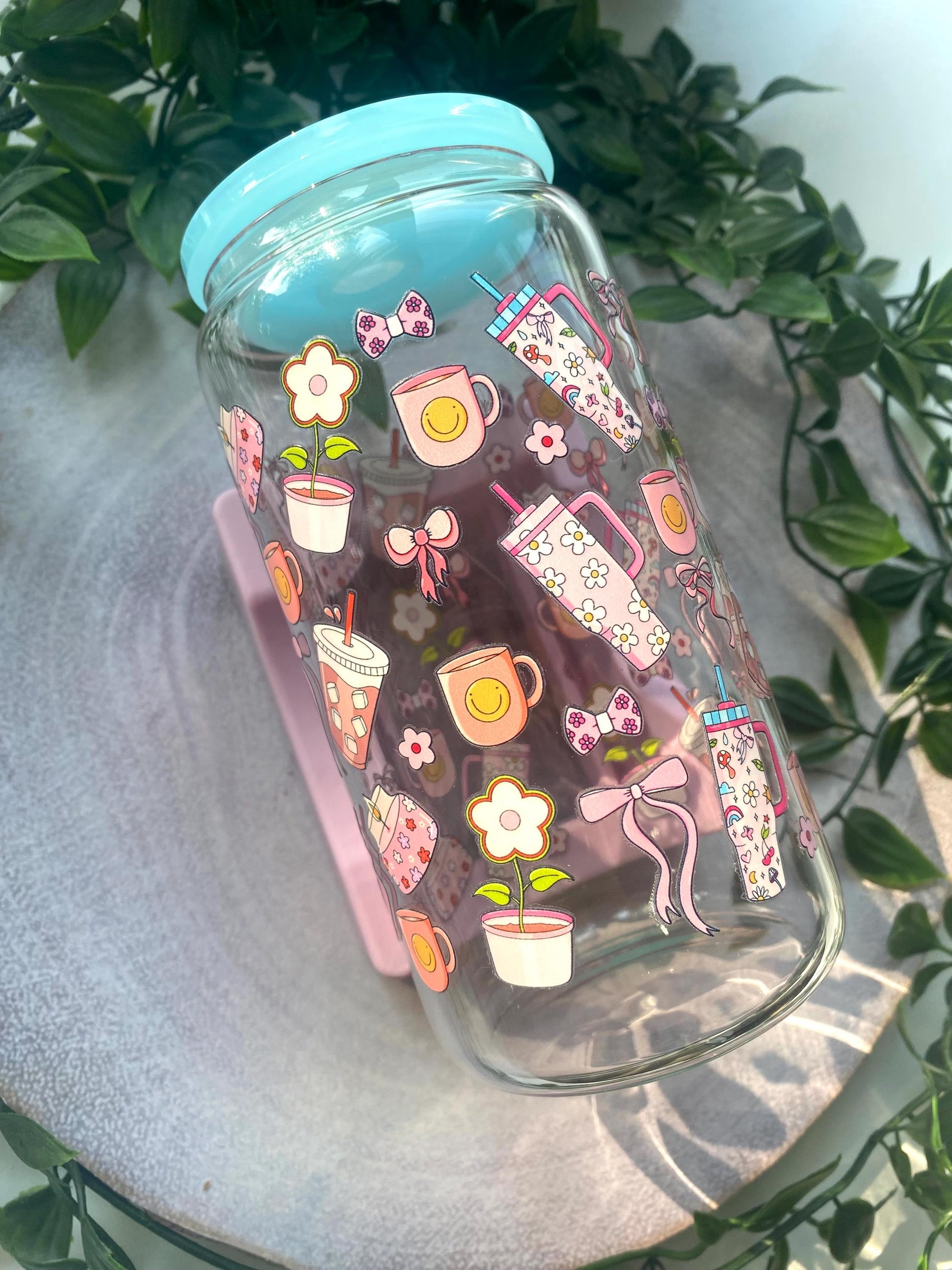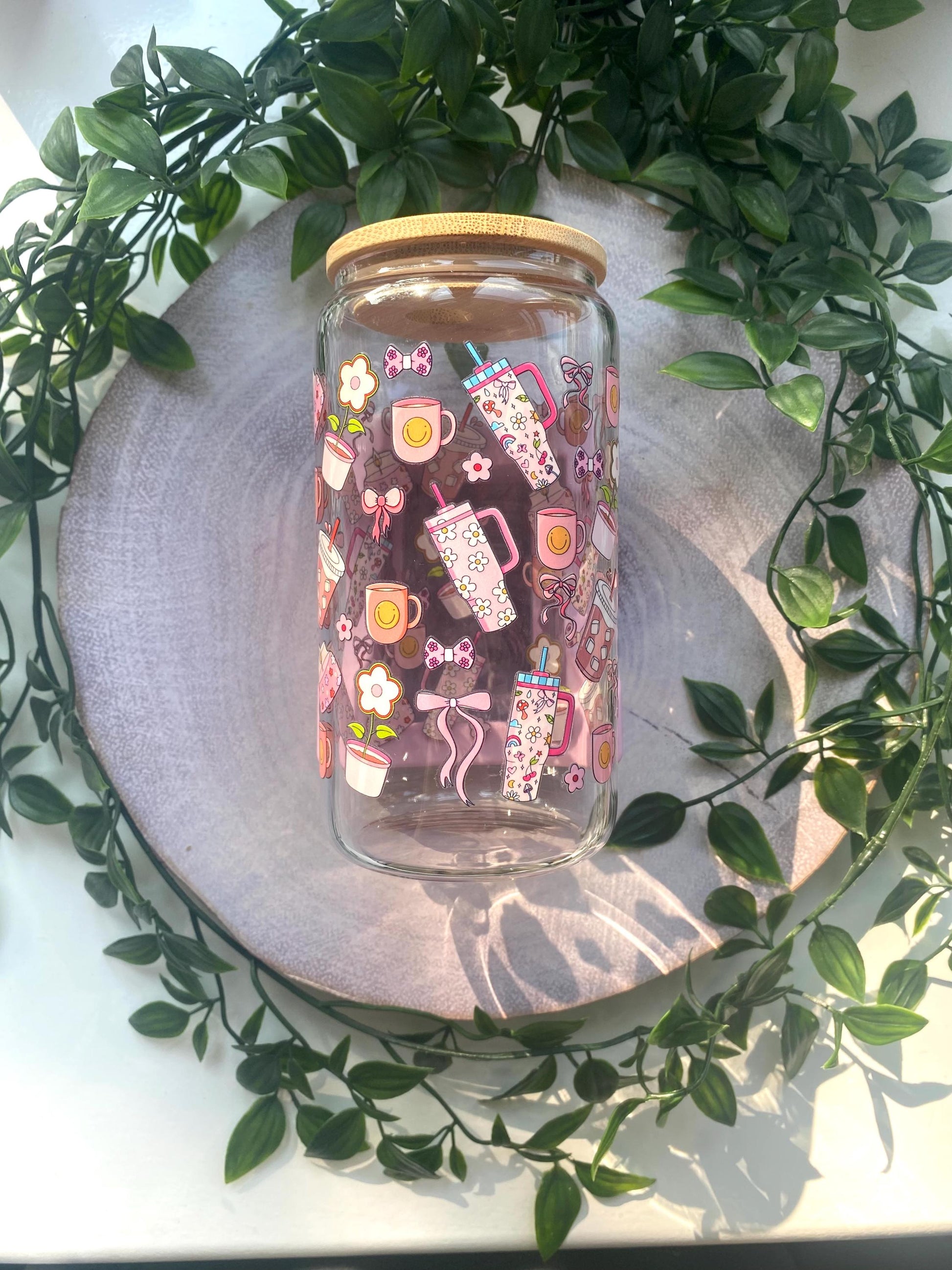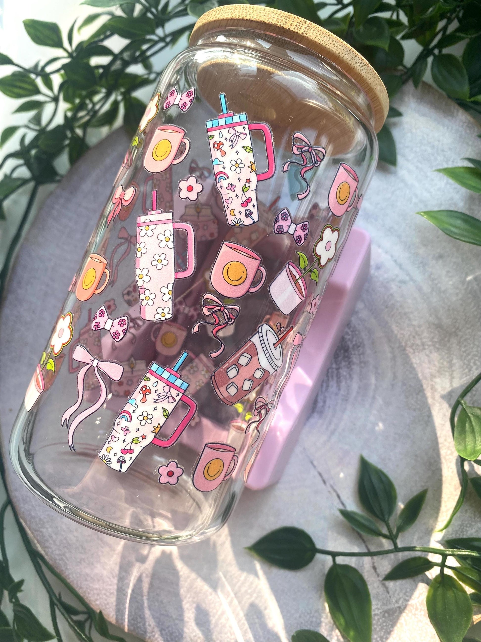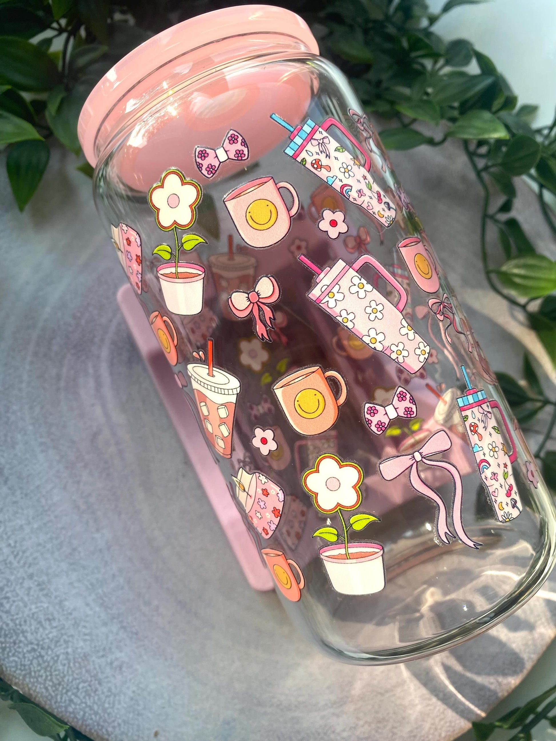 The Coquette Cafe Glass Cup is bursting with charm, decorated with coffee cups, takeaway drinks, dainty flowers, bows, and sweet little details. Perfect for anyone who loves their beverages served with a side of cuteness, it’s a cheerful way to brighten every sip.