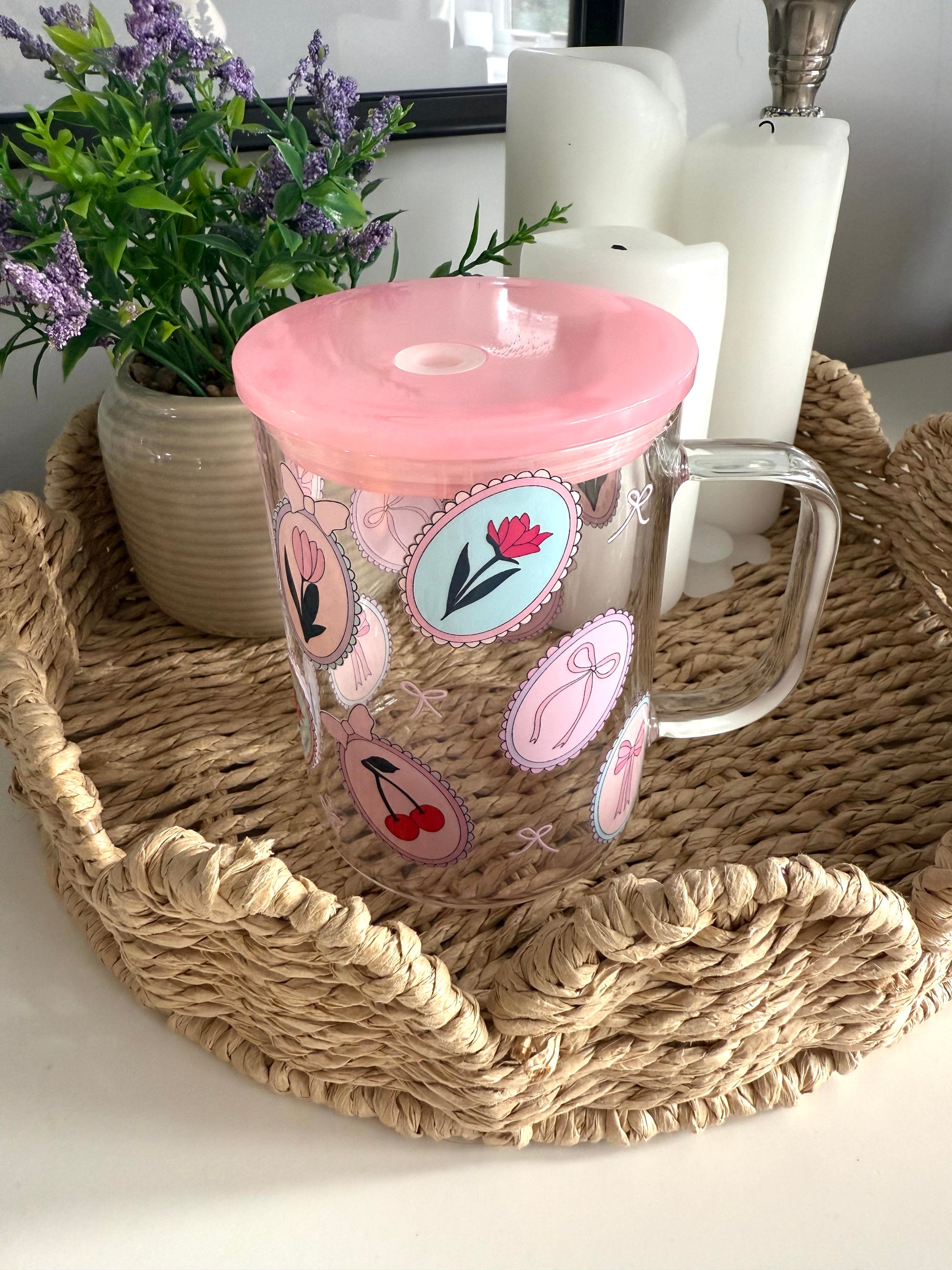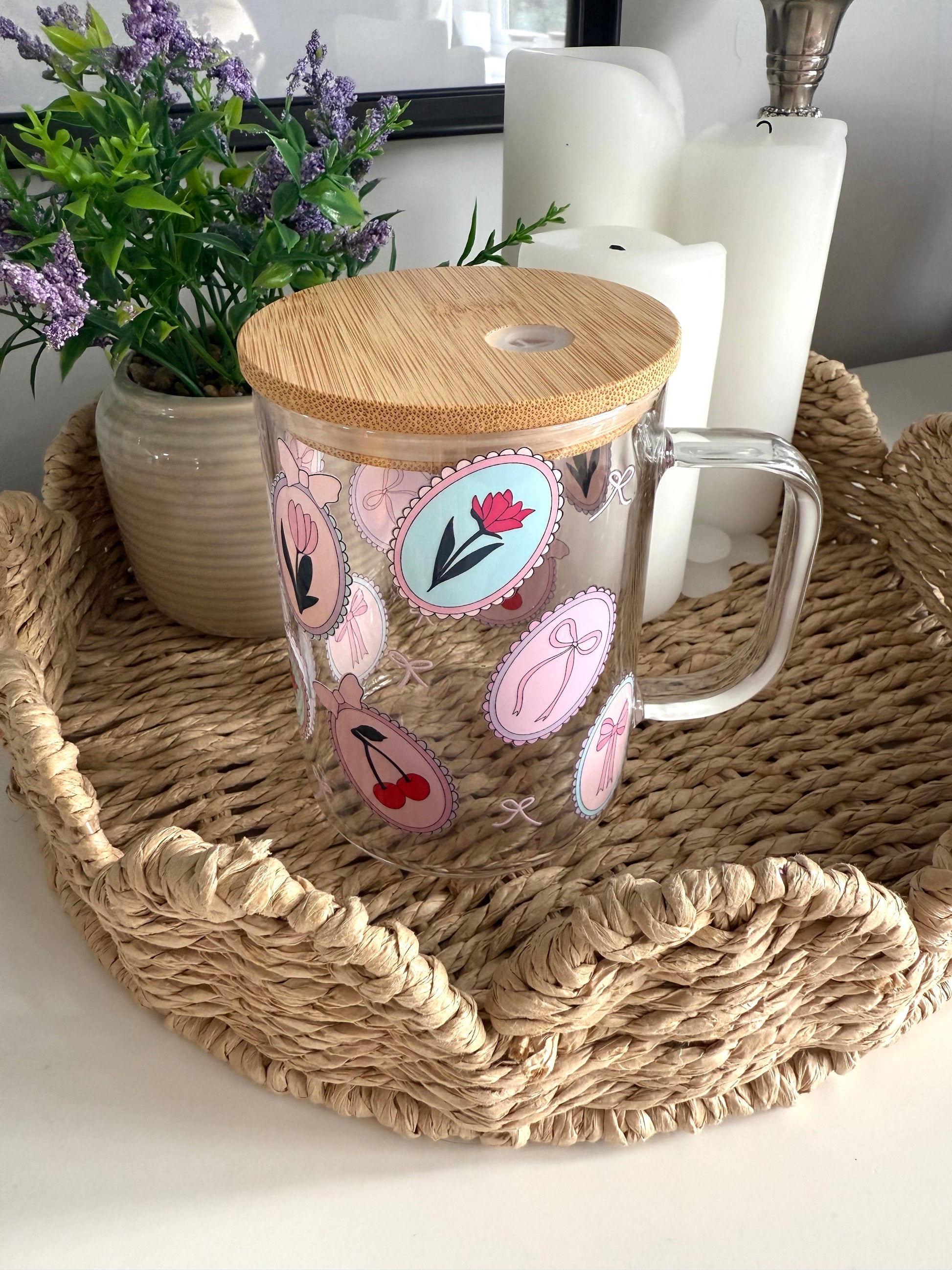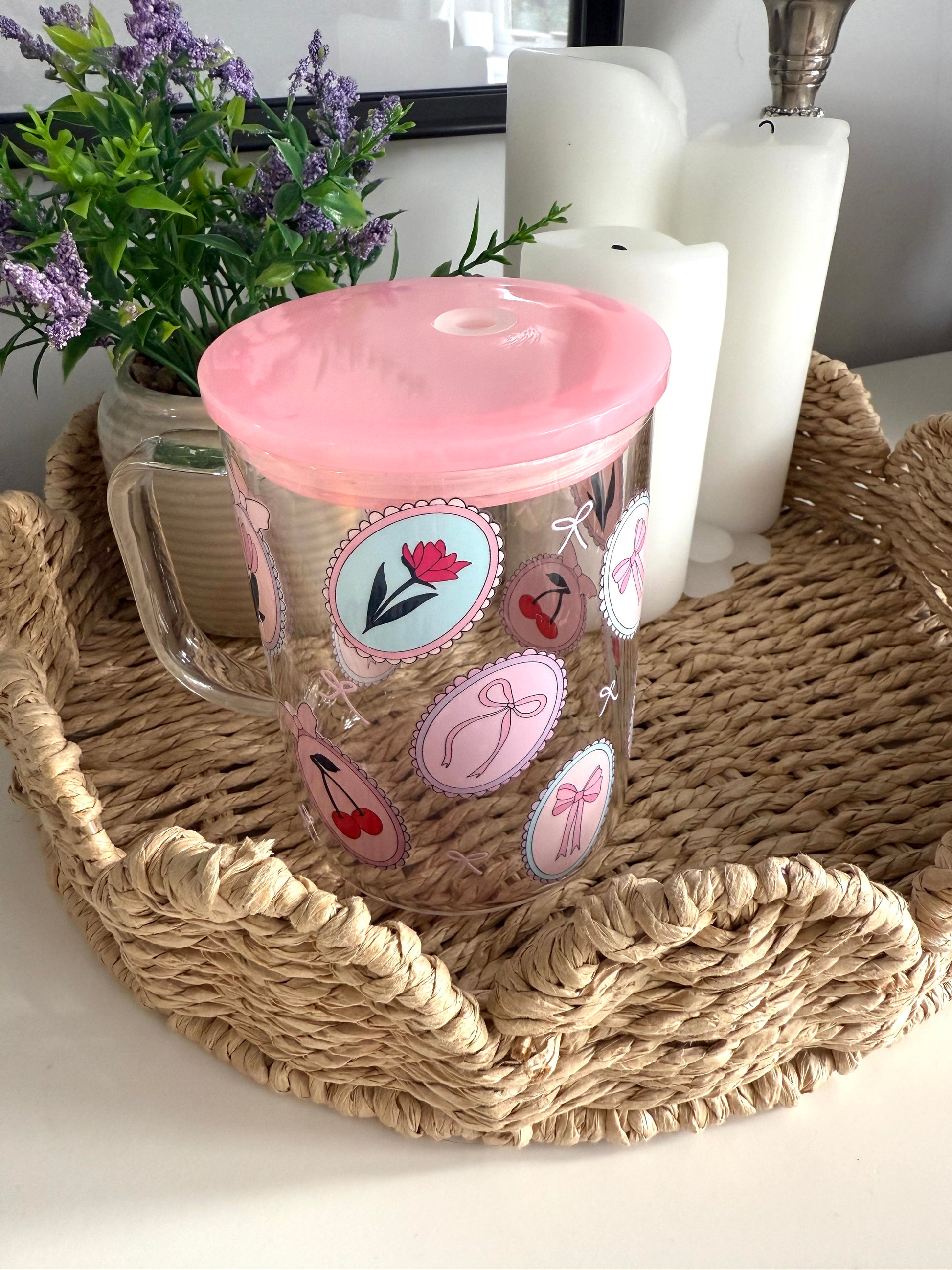 The Coquette Cameo Glass Mug is a sweet and dainty drinkware choice, decorated with pastel pink lids and charming oval frames featuring bows, tulips, and cherries. Perfect for adding a soft, feminine touch to your daily sipping routine.