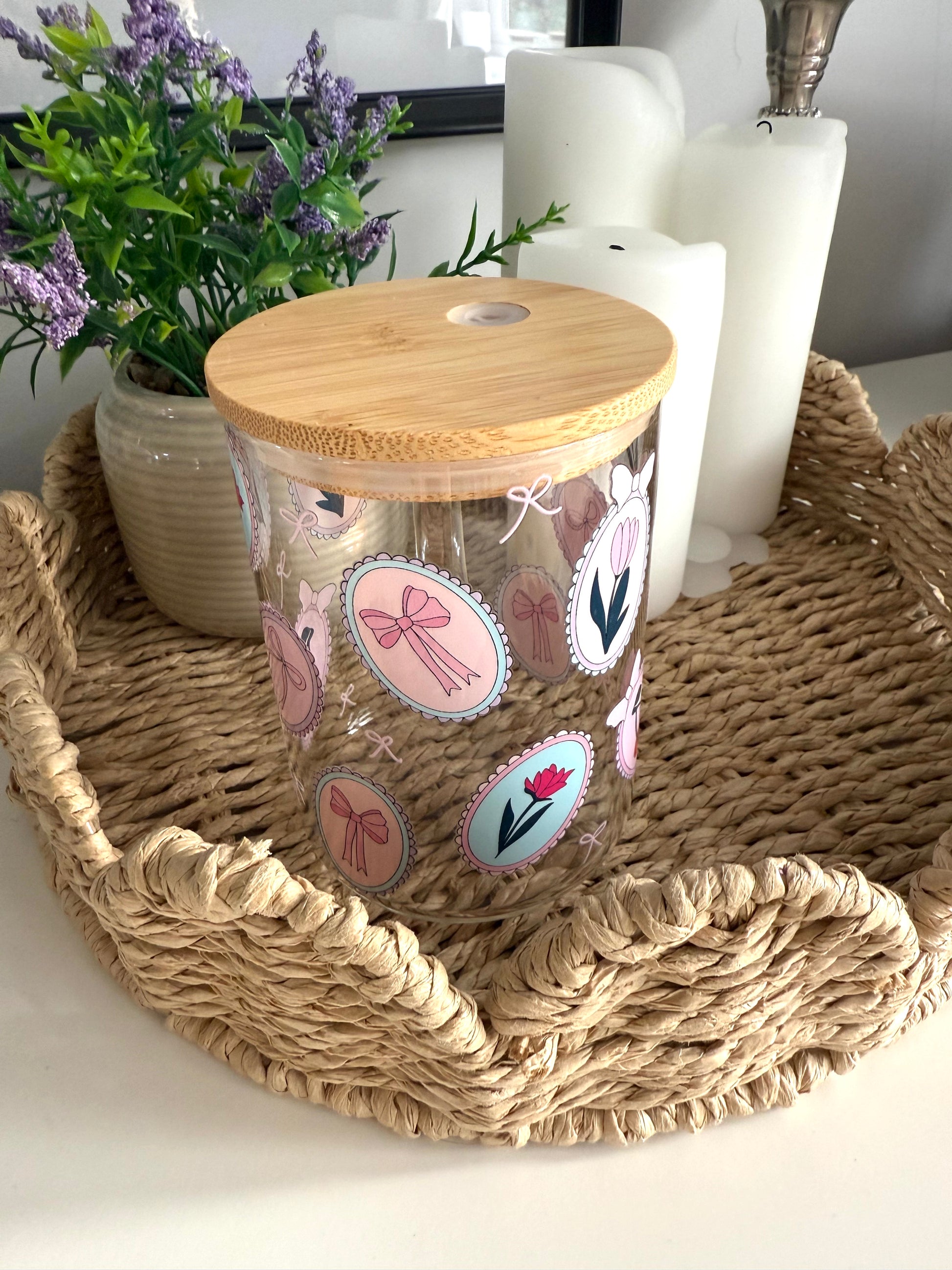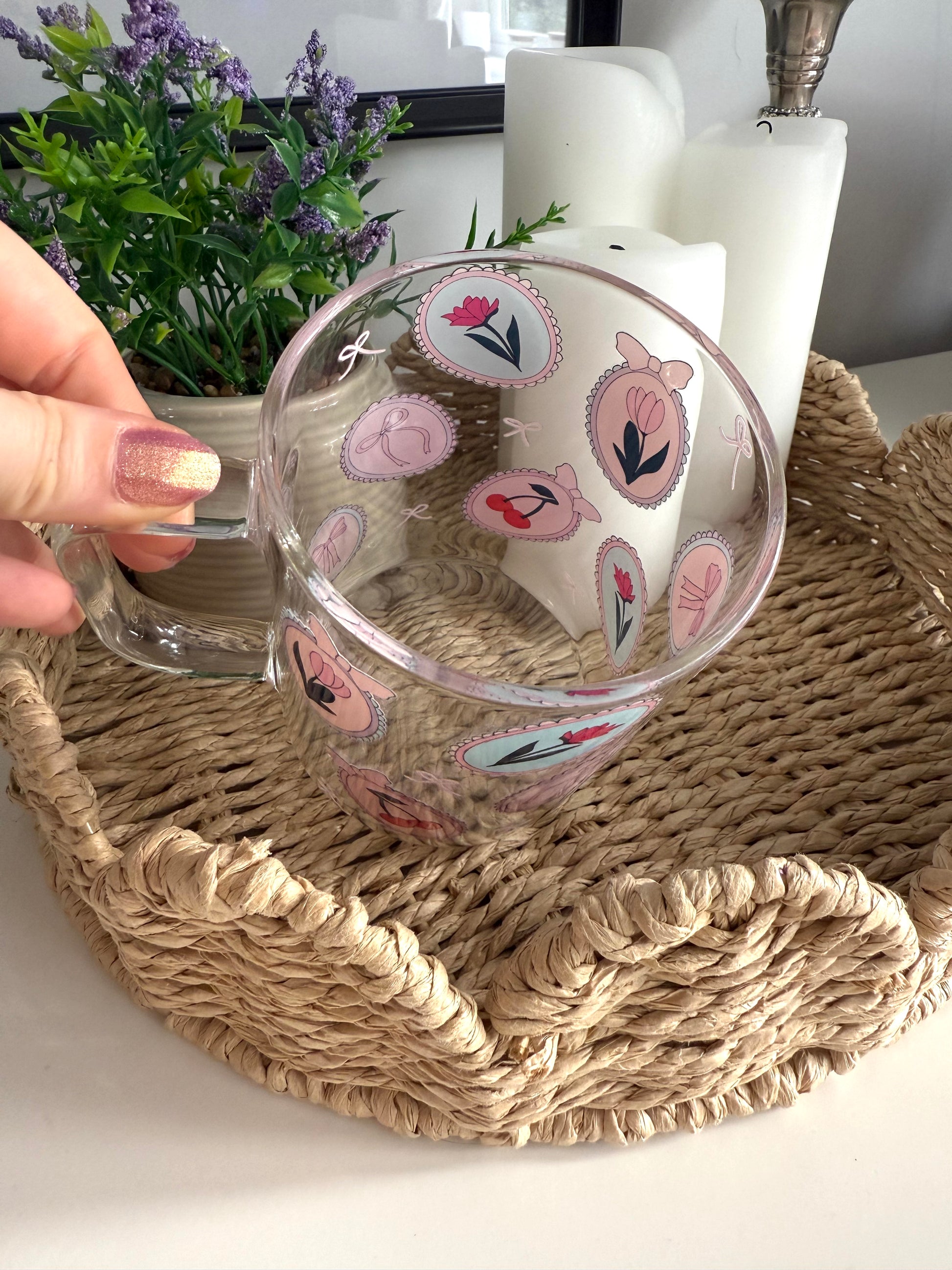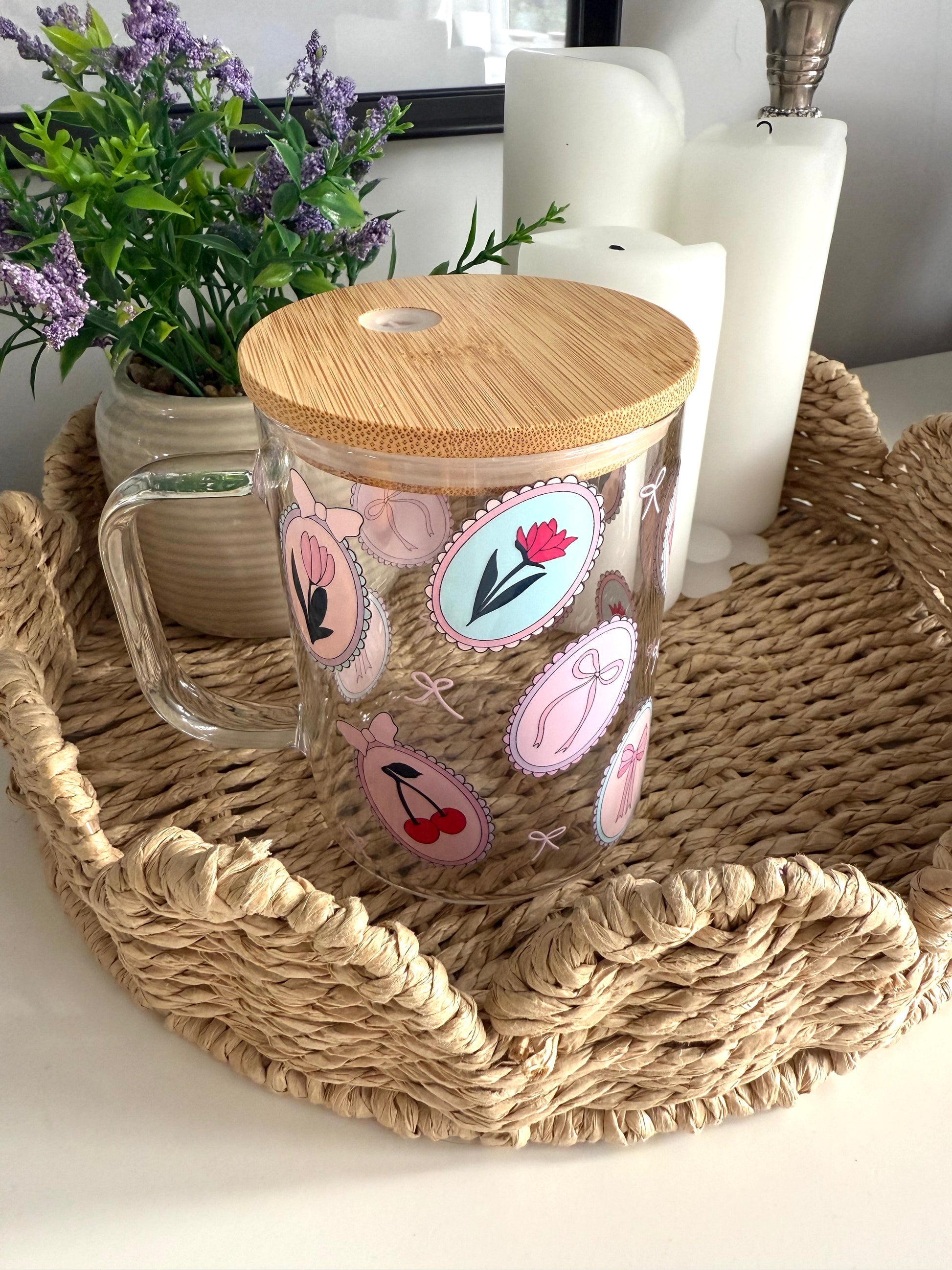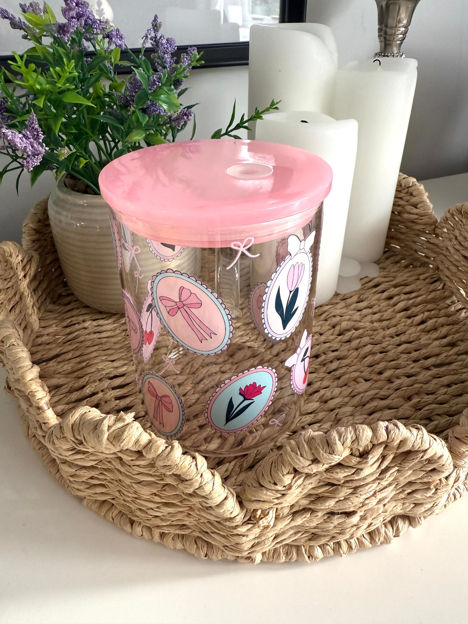 The Coquette Cameo Glass Mug is a sweet and dainty drinkware choice, decorated with pastel pink lids and charming oval frames featuring bows, tulips, and cherries. Perfect for adding a soft, feminine touch to your daily sipping routine.