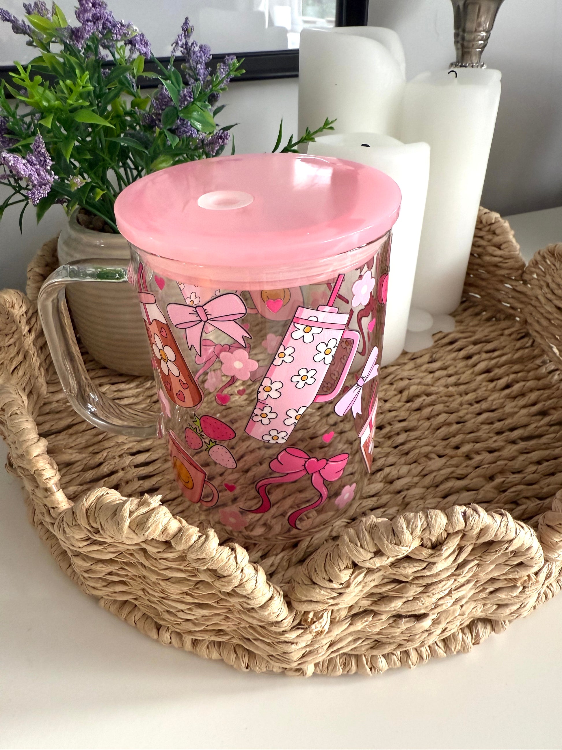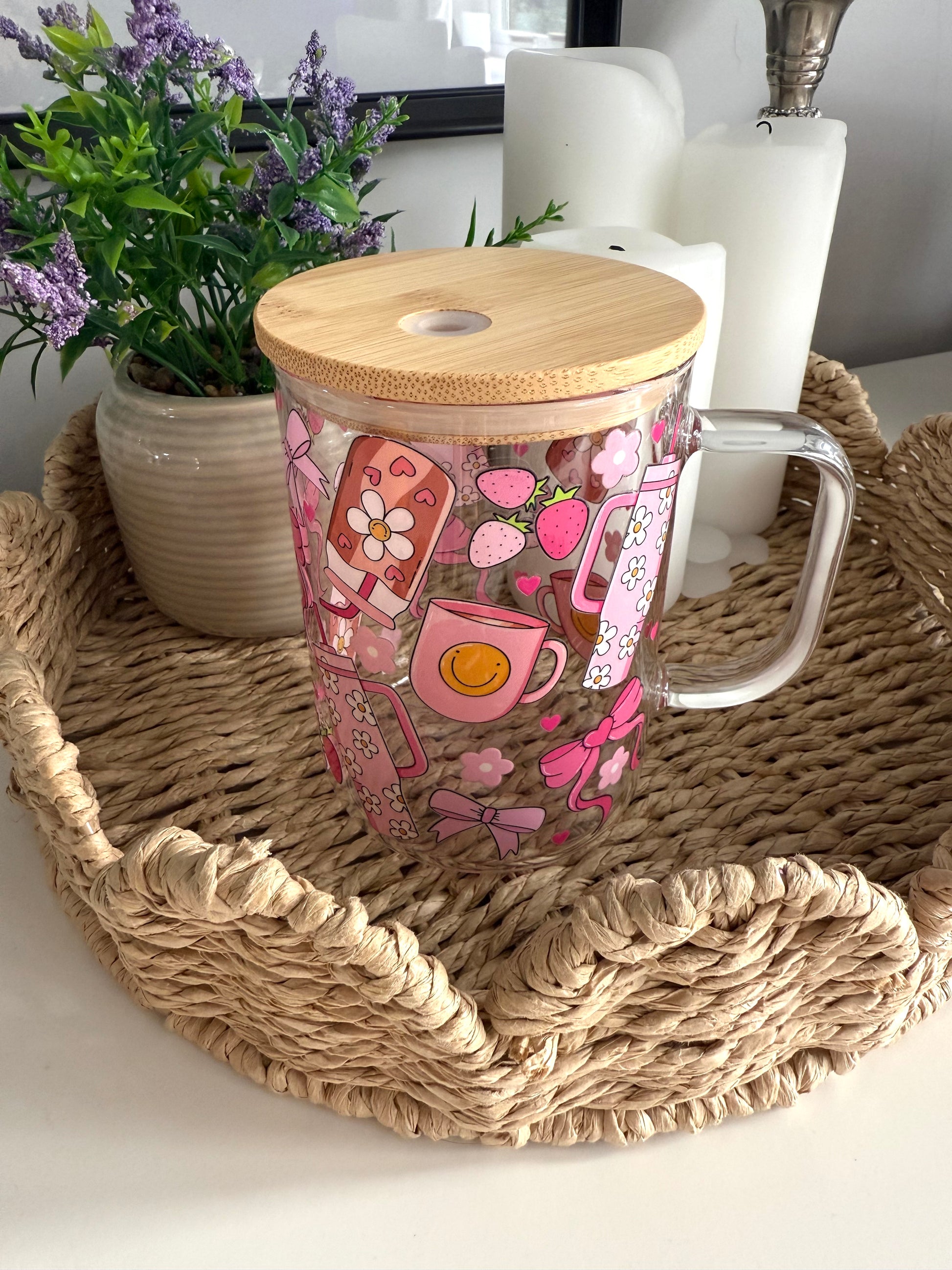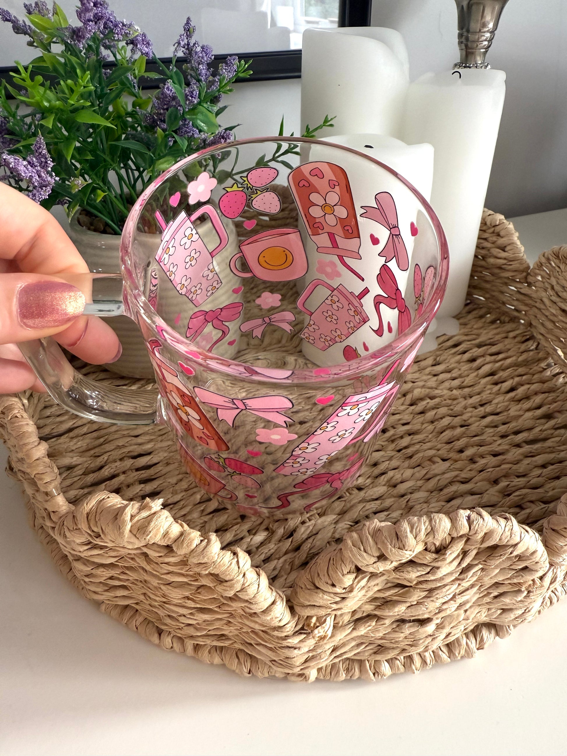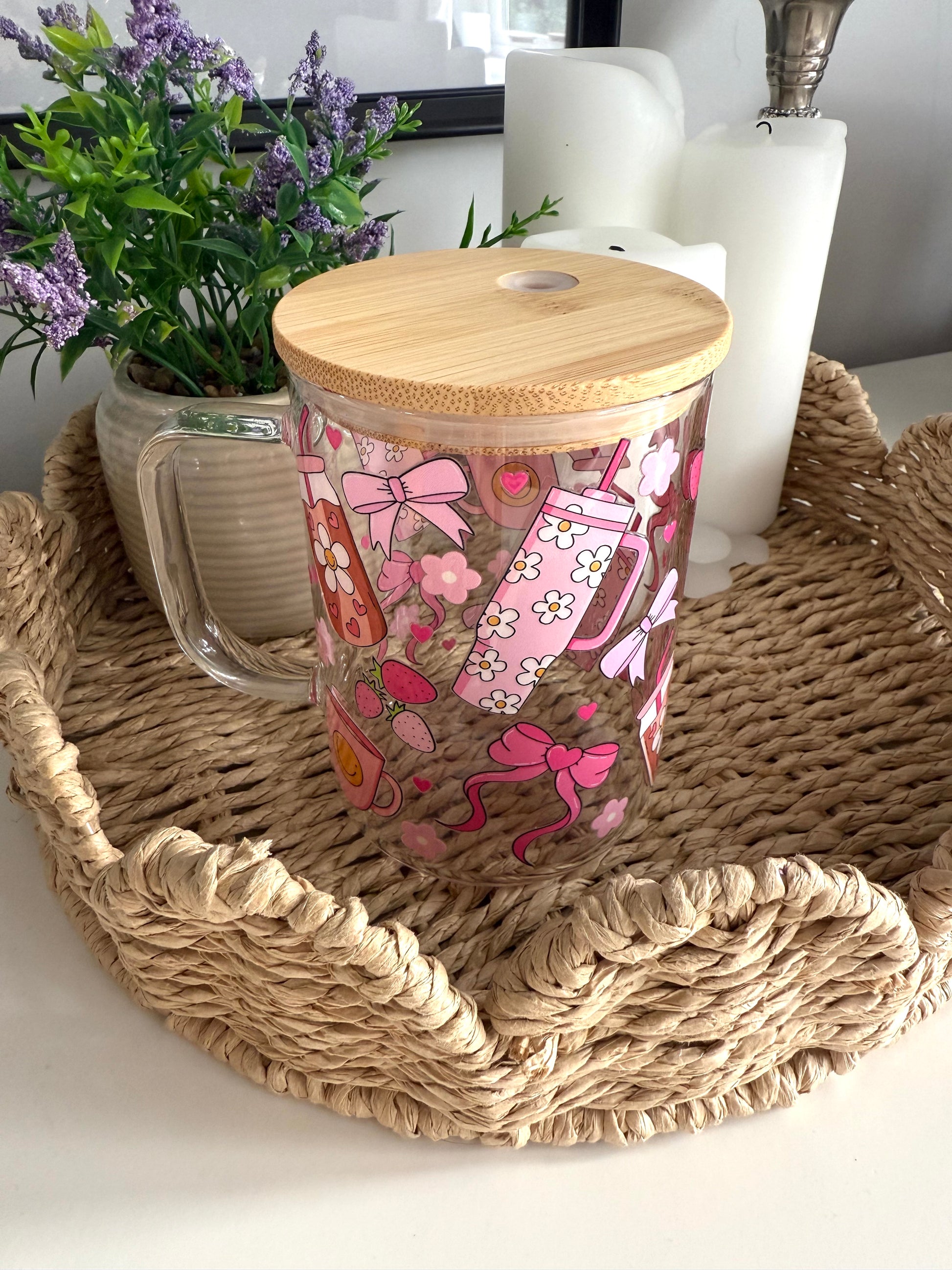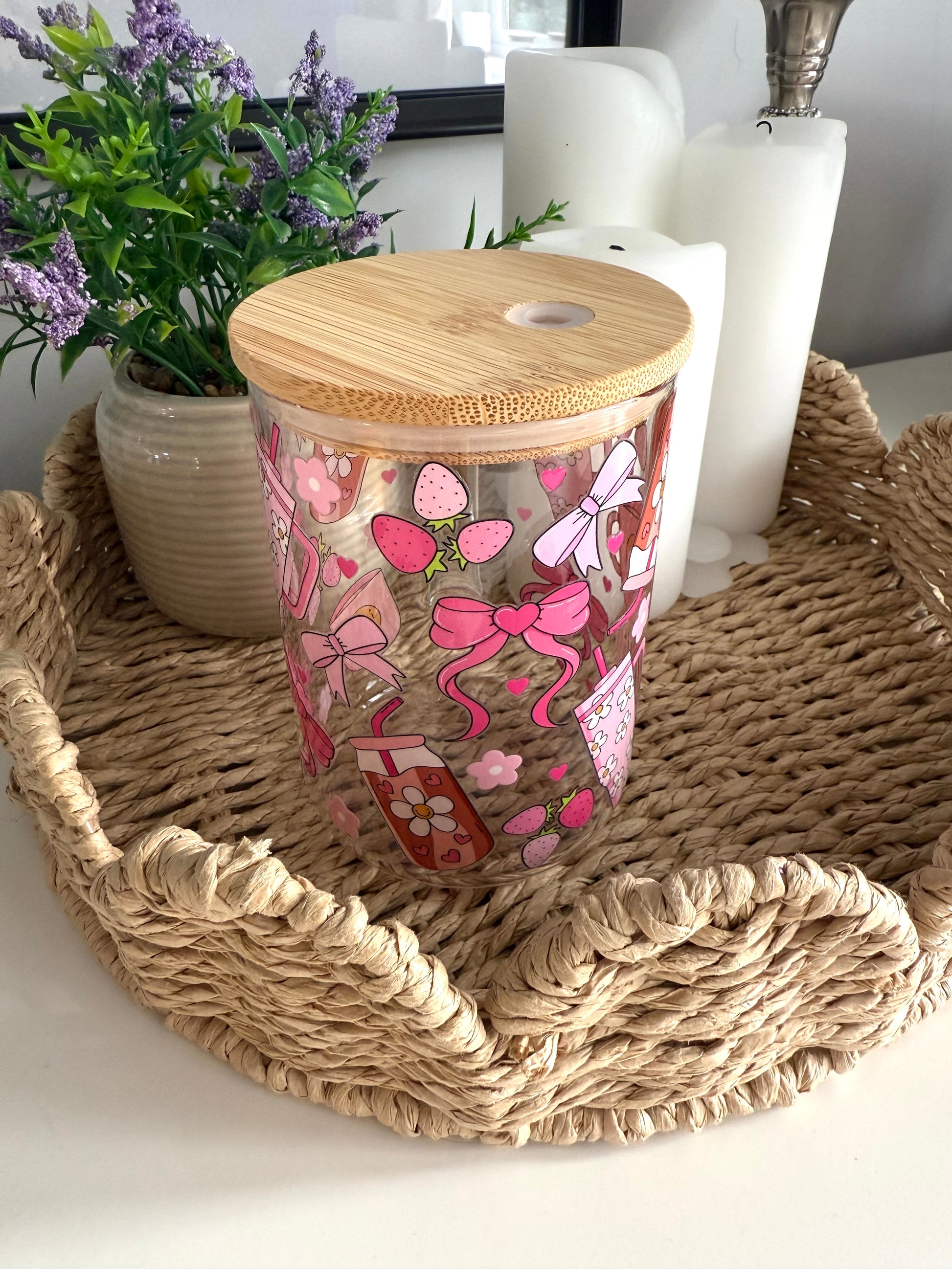 The Coquette Picnic Delight Glass Mug is the perfect blend of sweet and chic, featuring pink bows, dainty flowers, fresh strawberries, and adorable iced coffee drinks. Its playful design brings a touch of girly charm to every sip, making your drinkware as delightful as your beverage.