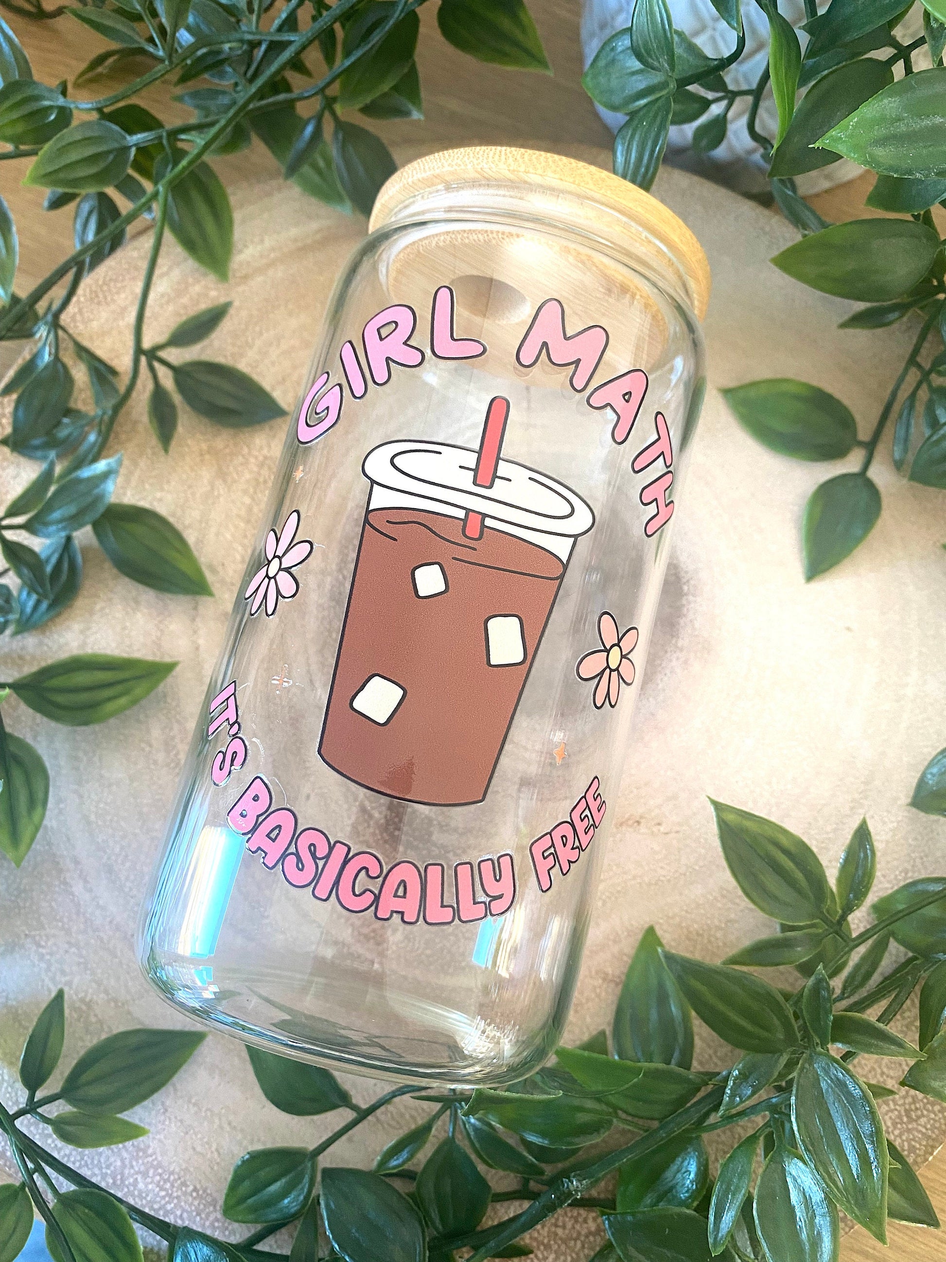 The Girl Math glass cup is playful and relatable, featuring a fun iced coffee illustration with the cheeky phrase “It’s basically free.” Perfect for enjoying your favorite drinks while embracing your best lighthearted logic.