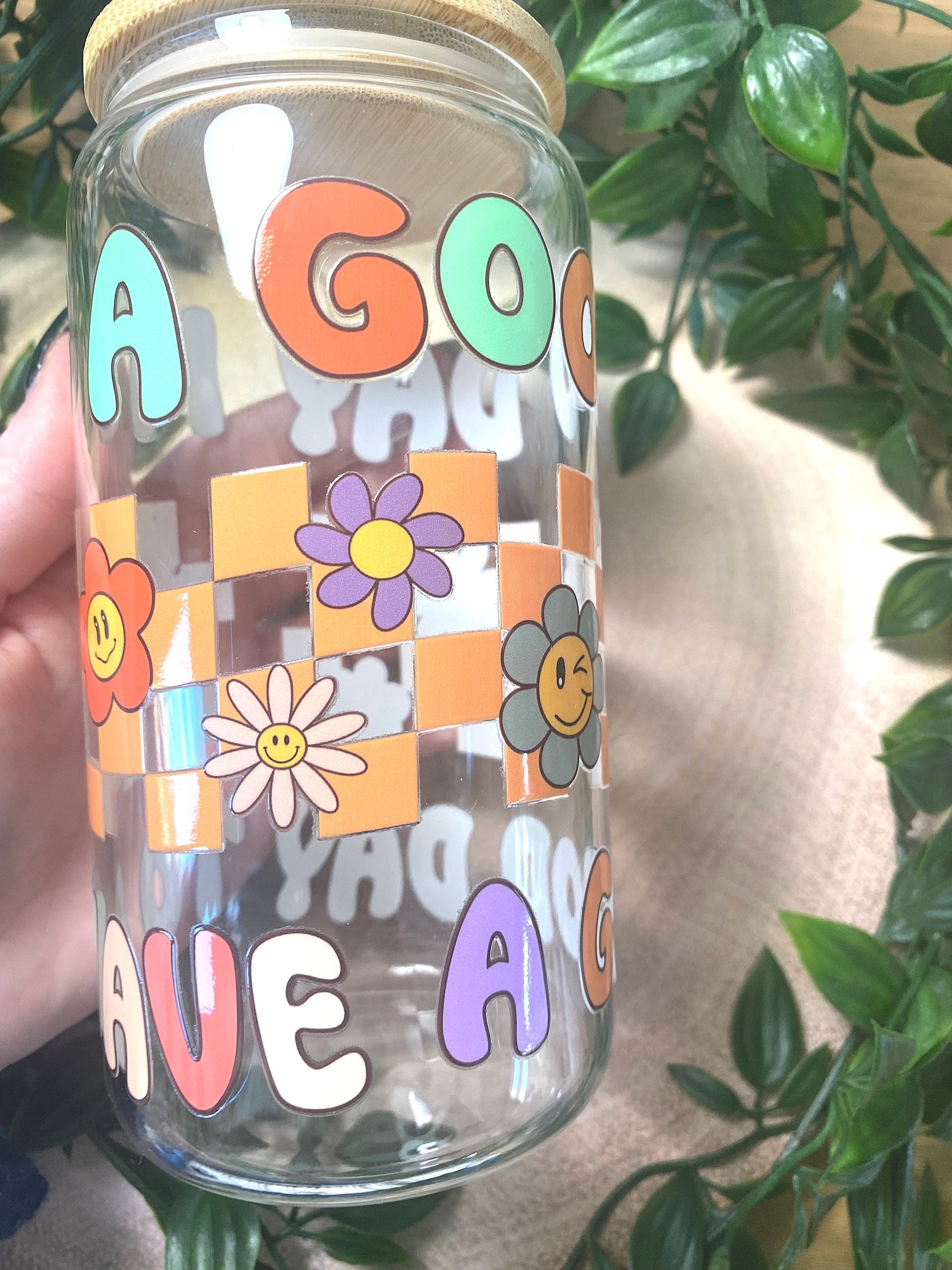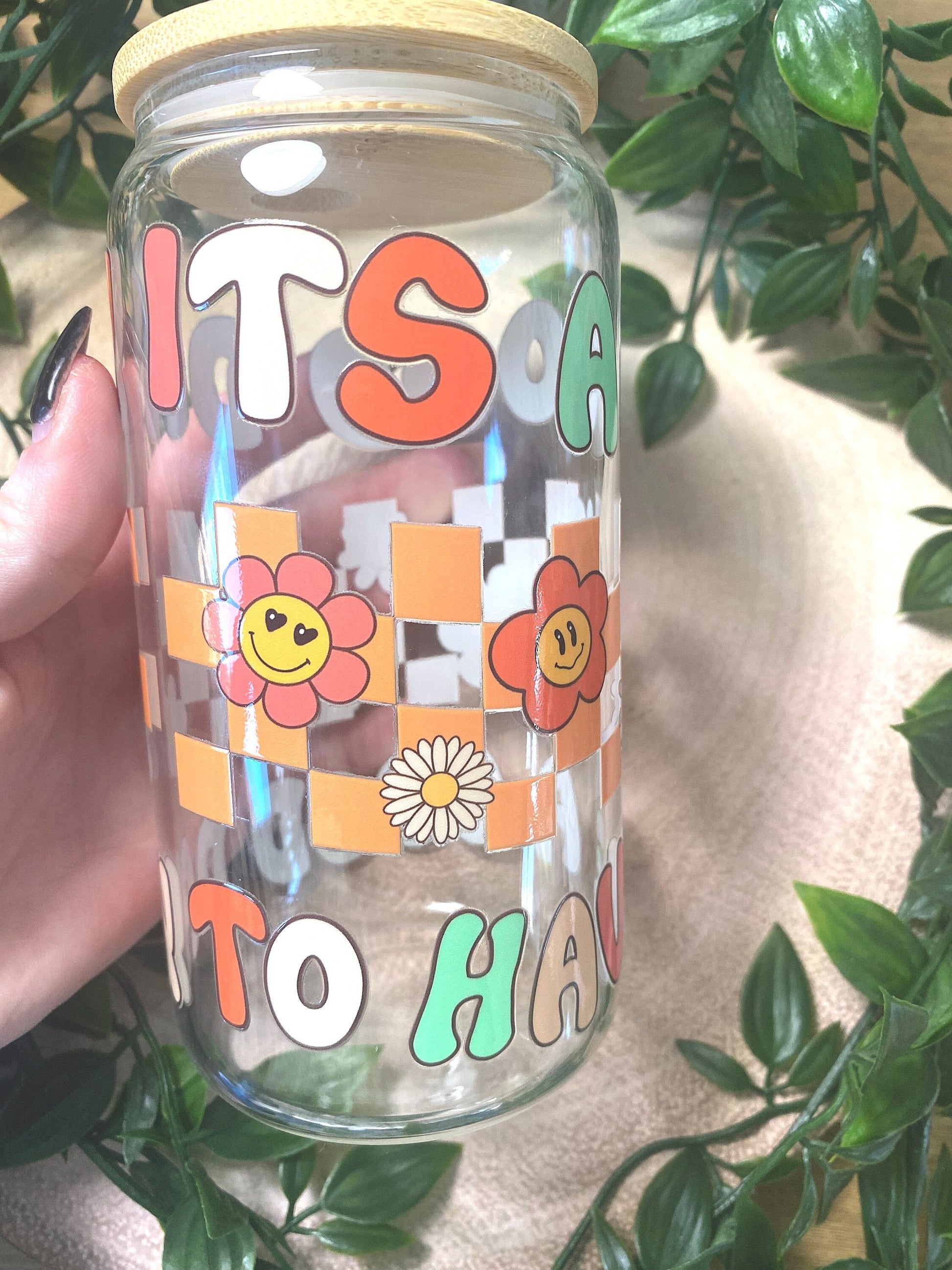 The It’s a Good Day to Have a Good Day glass cup radiates positivity with its bold retro lettering, cheerful smiley flowers, and playful orange checkered pattern. A feel-good design that will brighten your day with every sip.