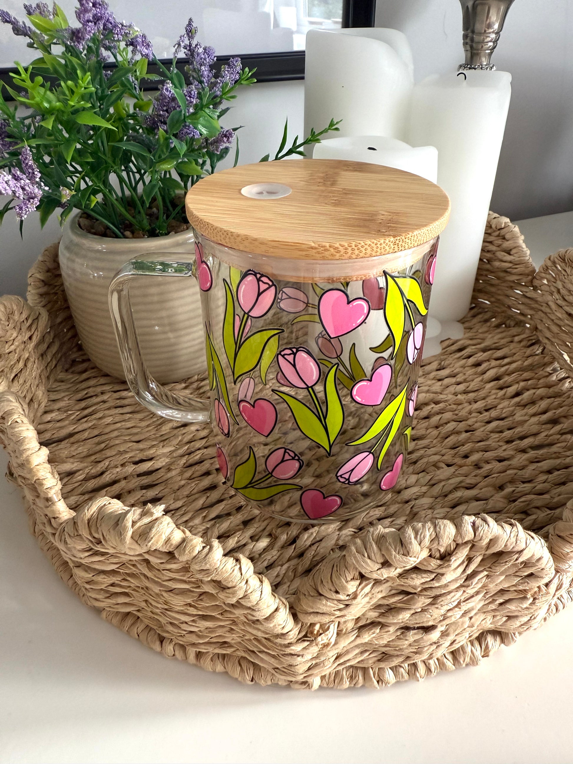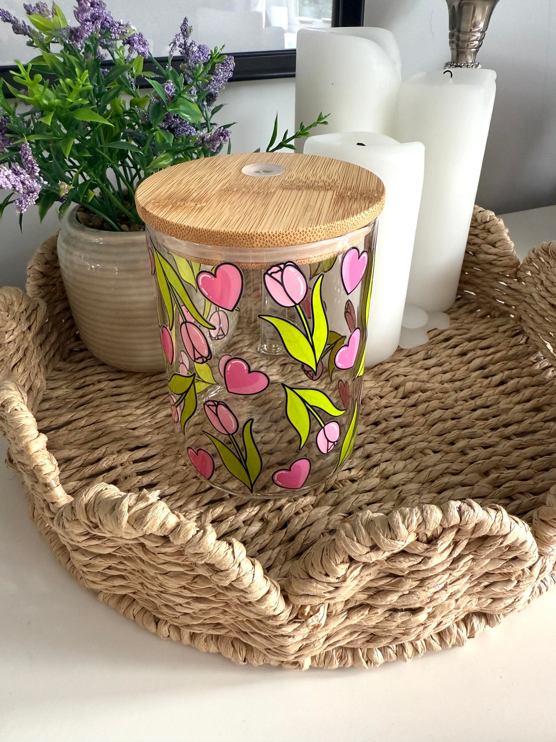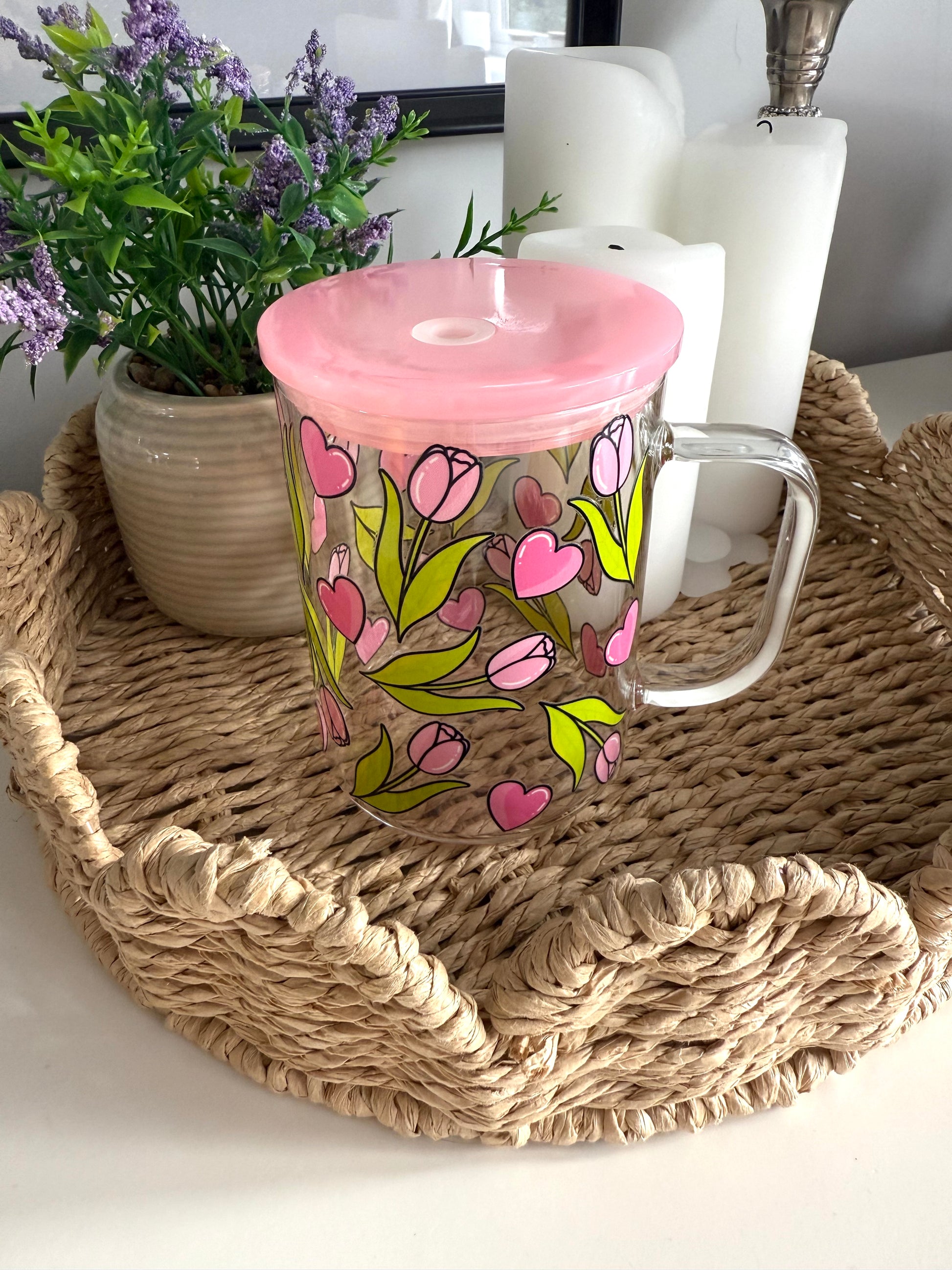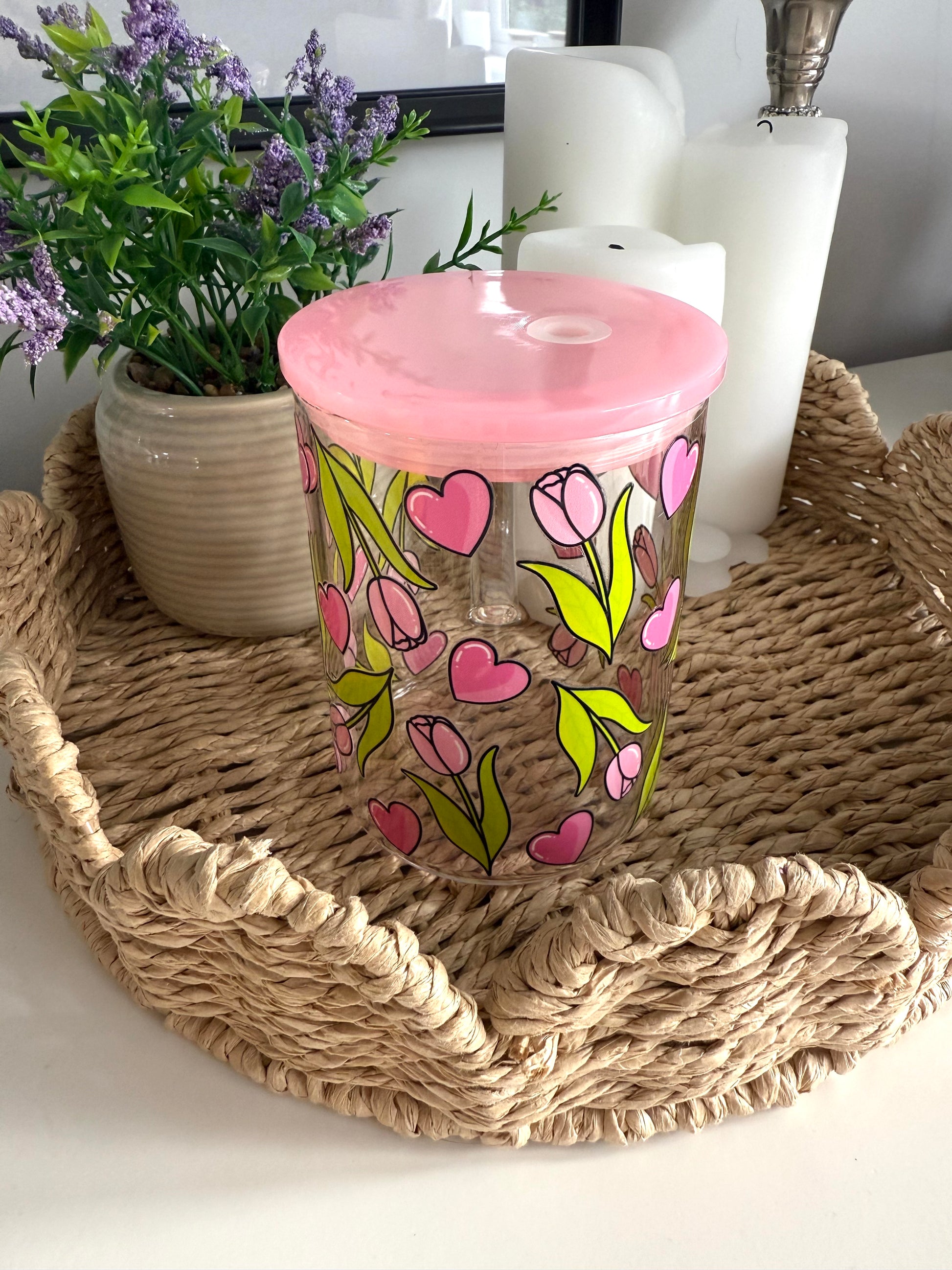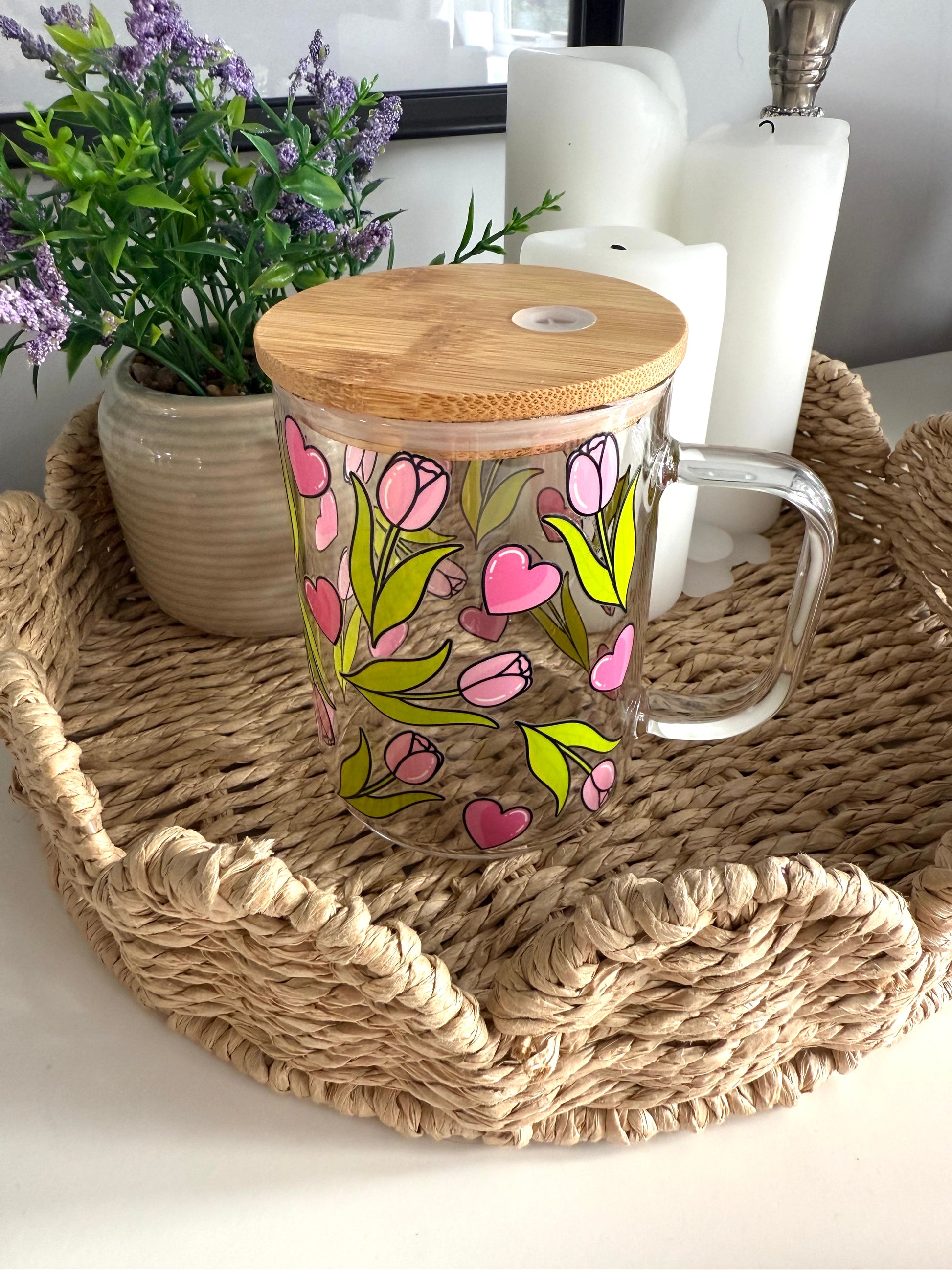 The Tulips & Hearts glass cup is blooming with charm, featuring delicate pink tulips paired with bright green leaves and scattered pink hearts. Perfect for bringing a fresh, romantic touch to your daily drinkware.