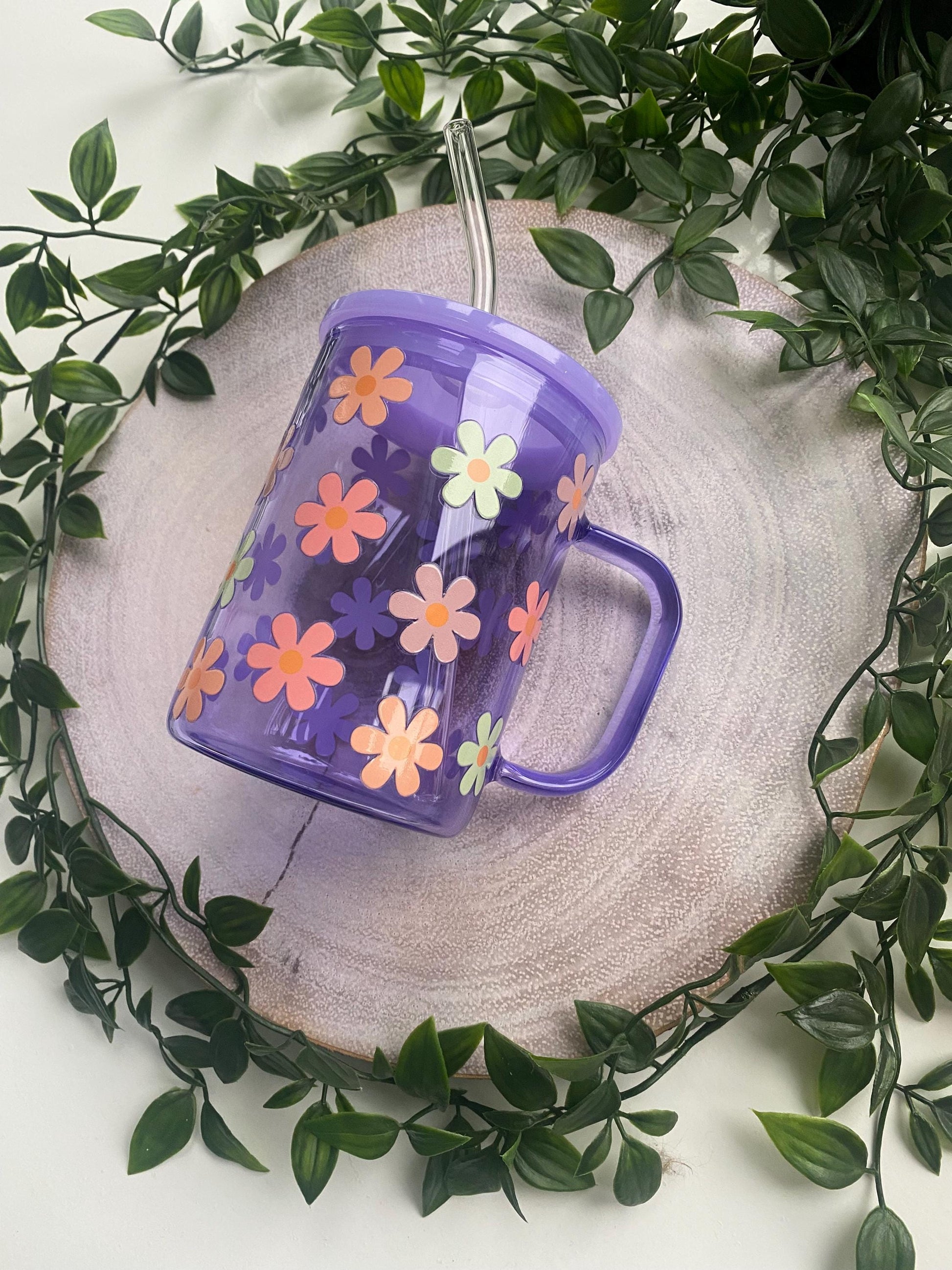 The Retro Pastel Daisies glass mug is a burst of groovy charm, featuring vibrant orange, pink, and yellow daisy-style flowers across a rich purple base. Perfect for adding a fun, vintage-inspired touch to your favourite drinks.