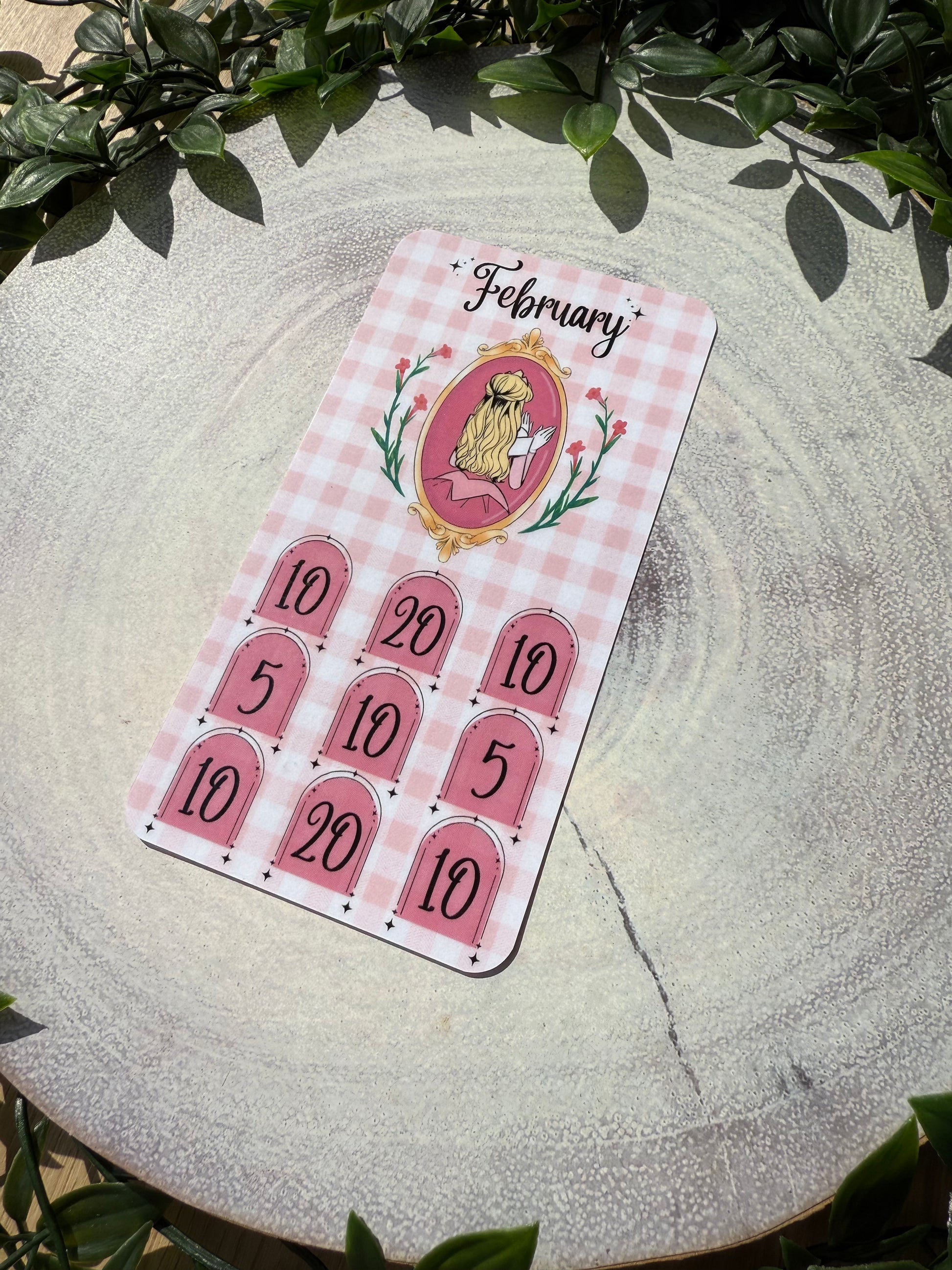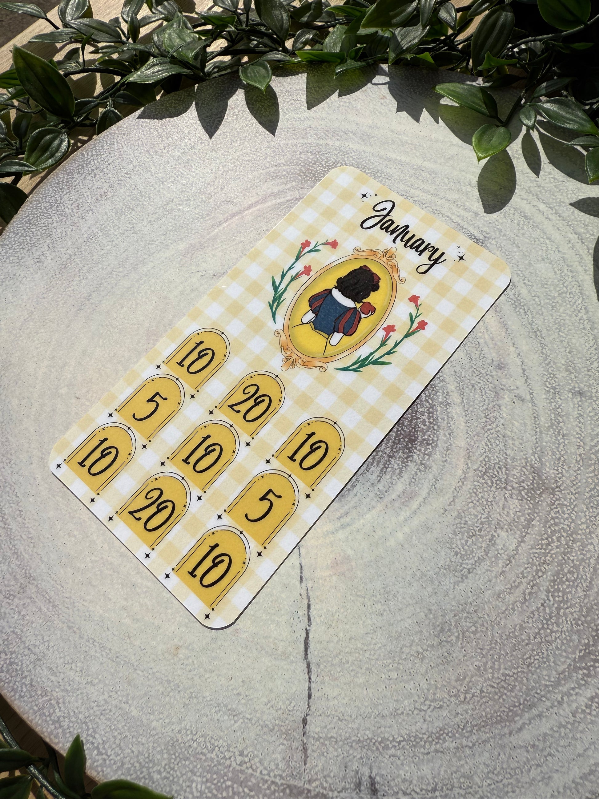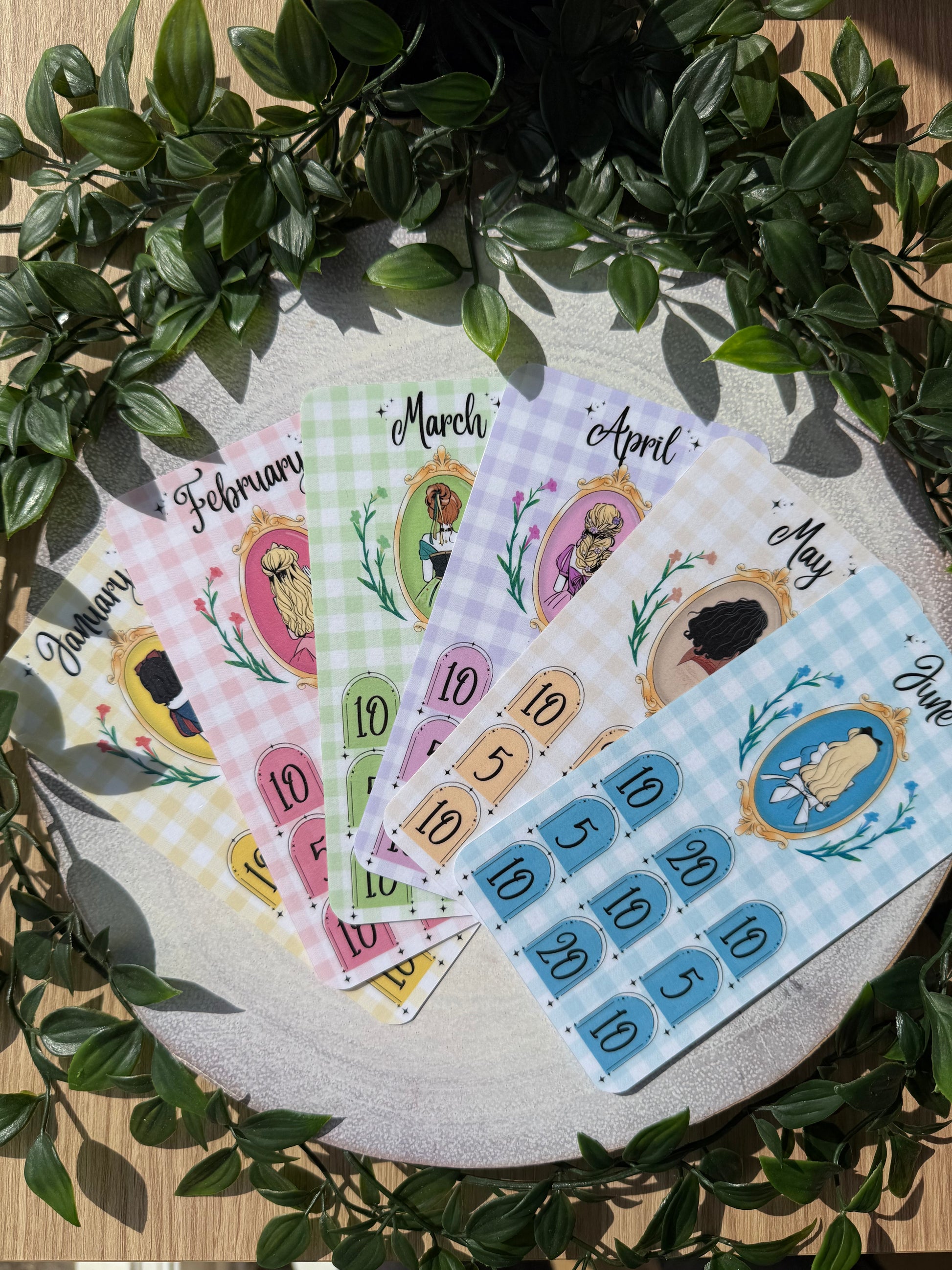 The Once Upon a Budget Collection includes 12 beautifully printed princess savings trackers, each designed on a pretty gingham background. With one princess for every month of the year, each tracker helps you save £100 — perfect for adding fun and motivation to your savings journey.