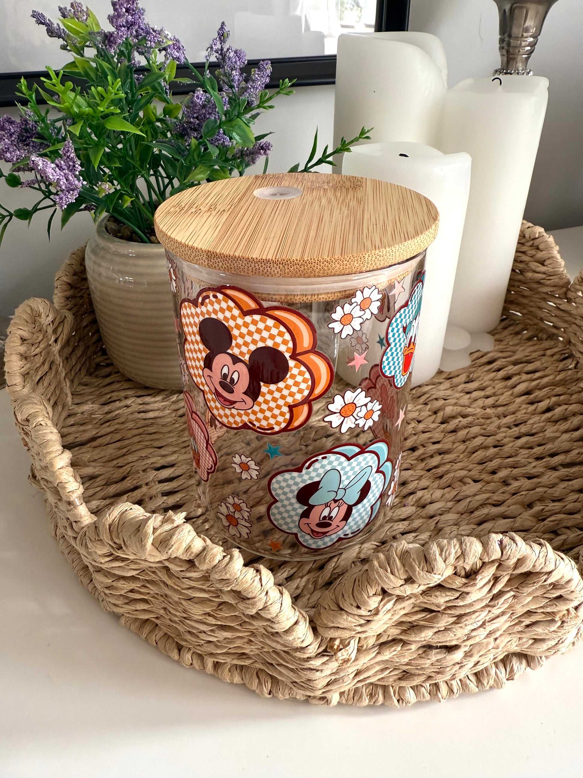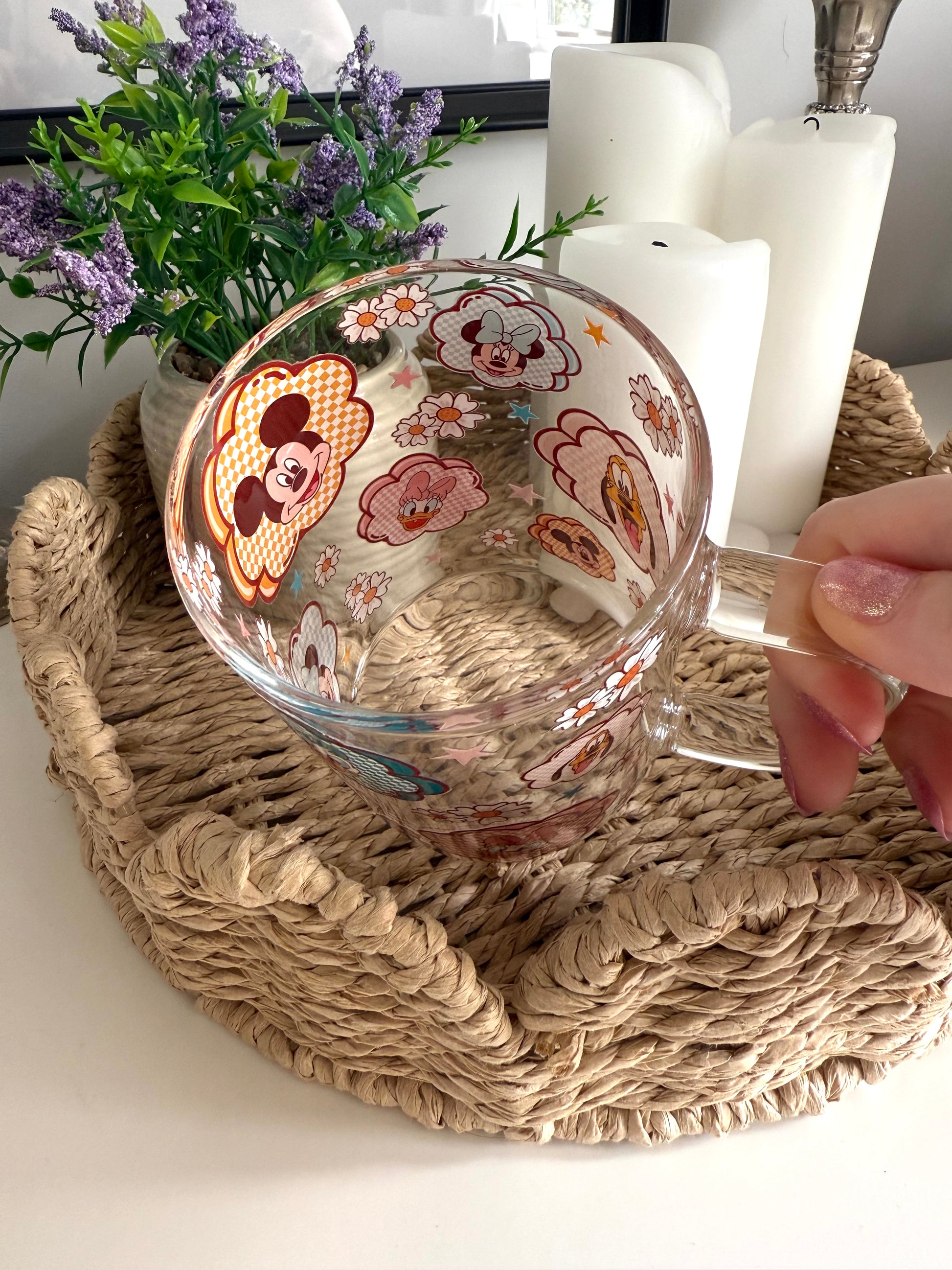 The Retro Friend Daisies Glass Mug features Minnie, Daisy, and other Disney favourites framed in gingham-style flower petals, surrounded by tiny daisies and stars for a sweet, whimsical vibe. Perfect for adding a sprinkle of Disney magic to every sip.