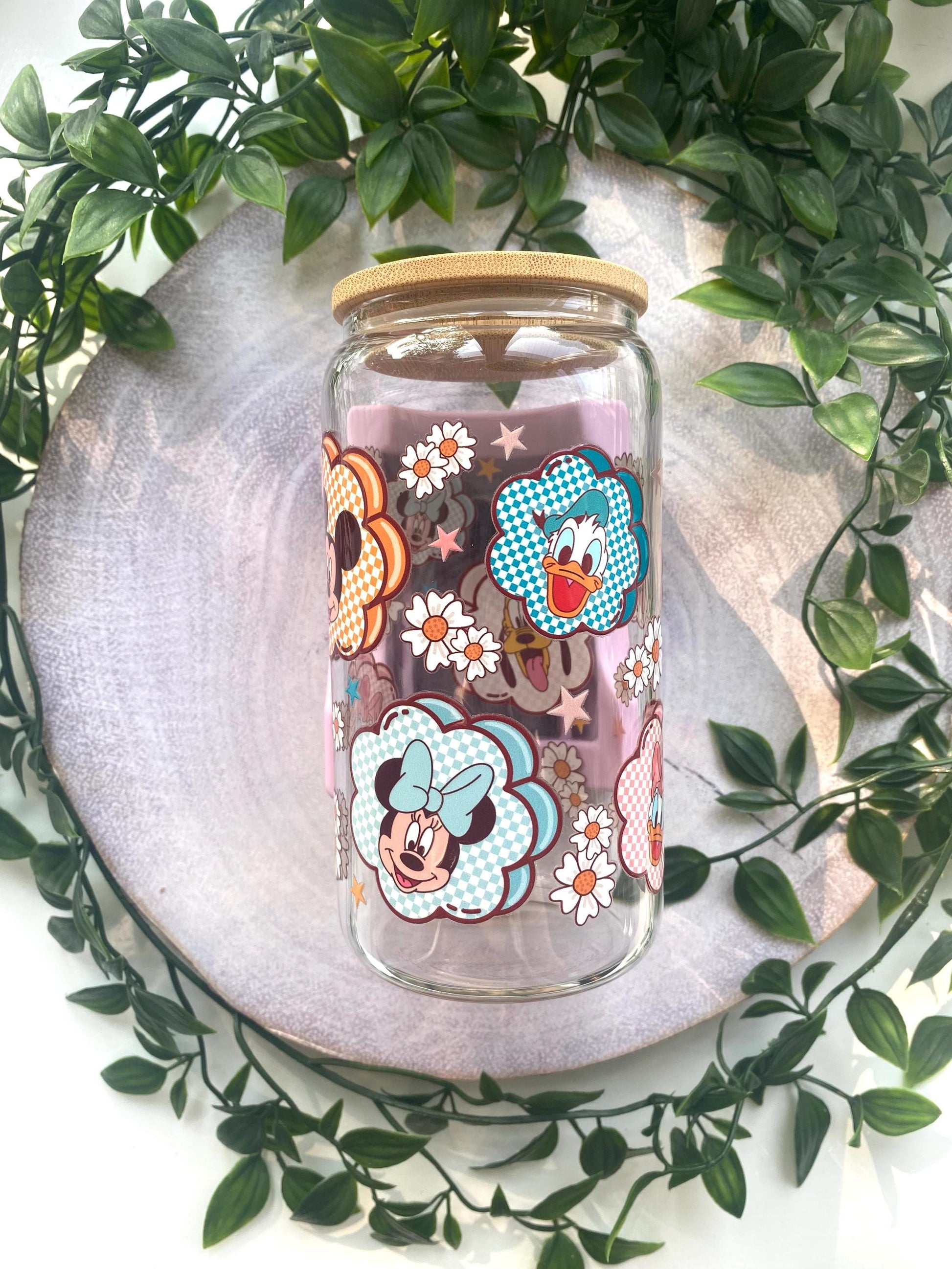 The Retro Friend Daisies Glass Cup features Minnie, Daisy, and other Disney favourites framed in gingham-style flower petals, surrounded by tiny daisies and stars for a sweet, whimsical vibe. Perfect for adding a sprinkle of Disney magic to every sip.