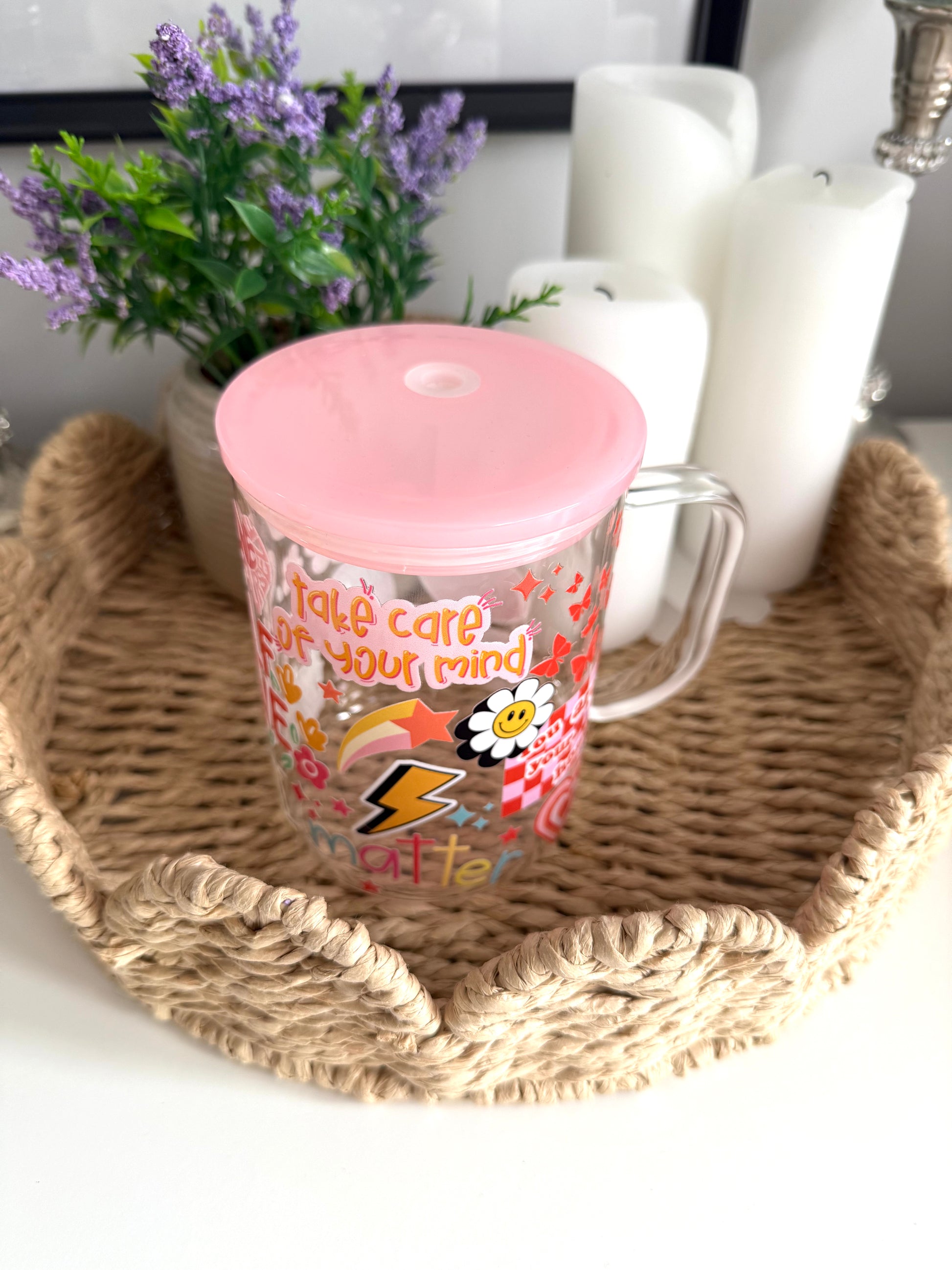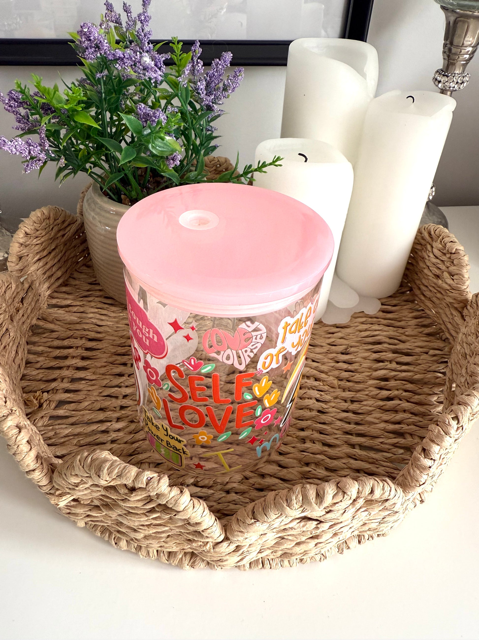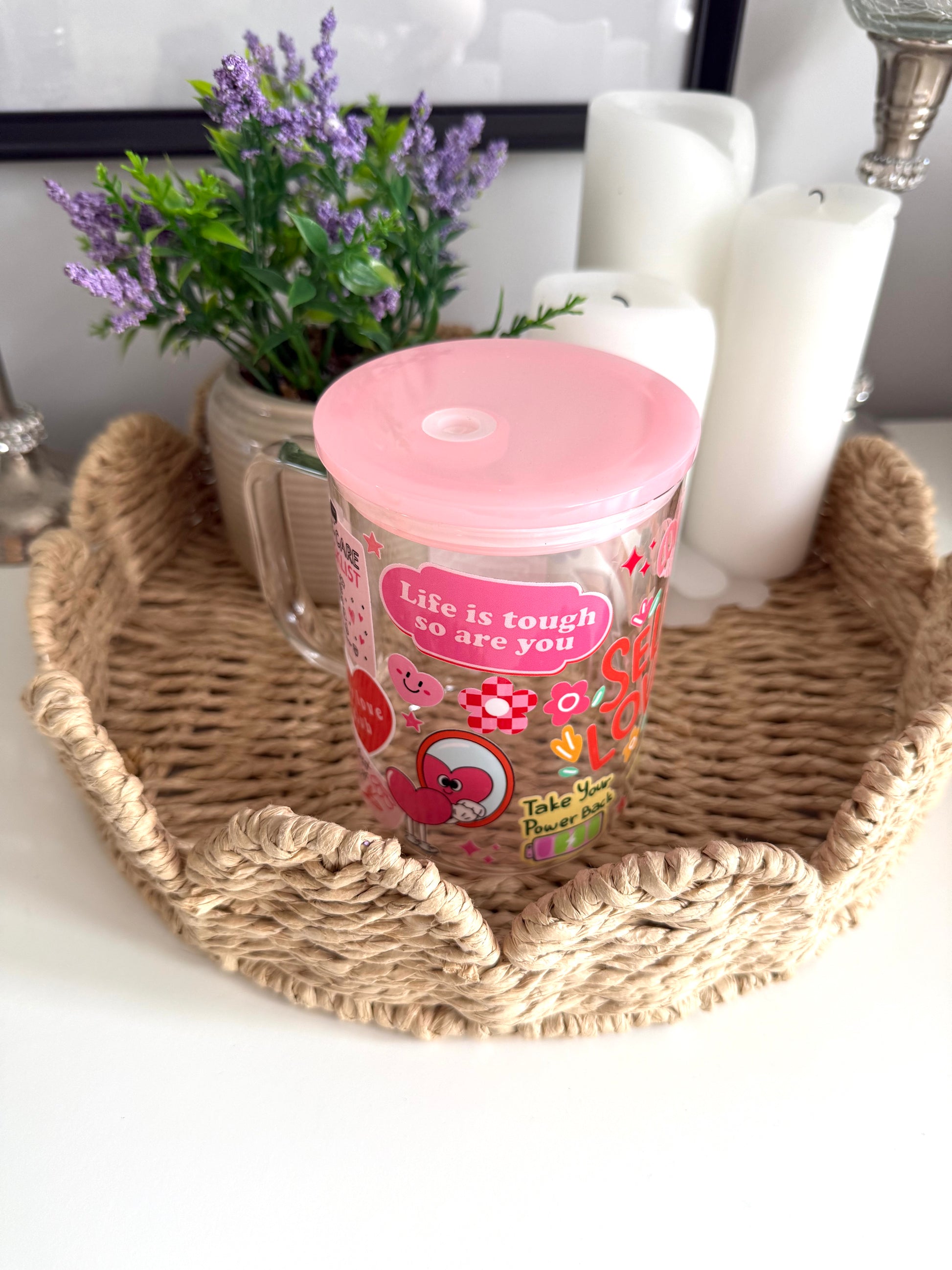 The Self Love glass mug is bright, uplifting, and full of positive energy, featuring colourful flowers, hearts, and empowering phrases like “Life is tough but so are you” and “Take your power back.” Perfect for sipping your favourite drink while giving yourself a daily boost of confidence.
