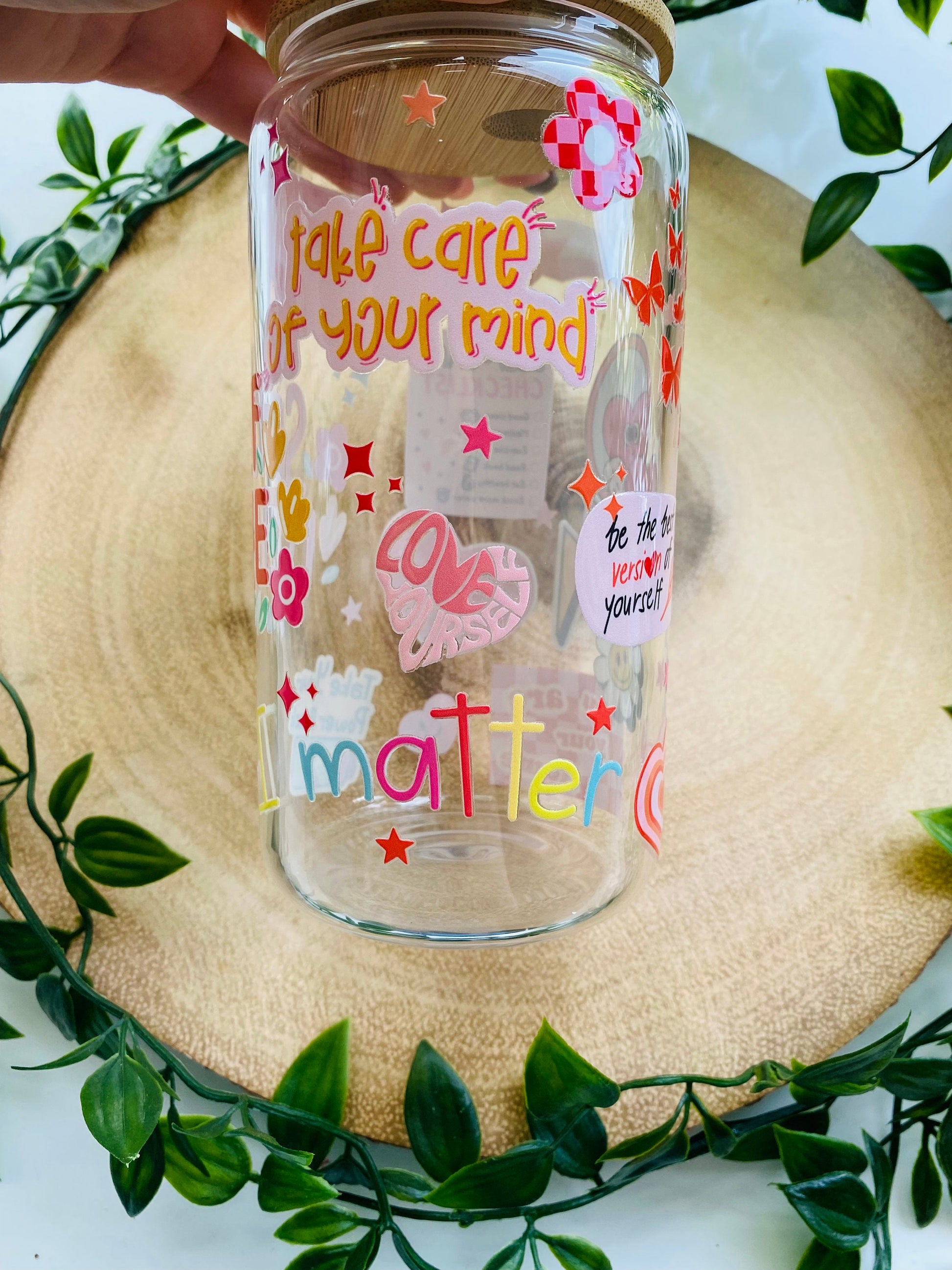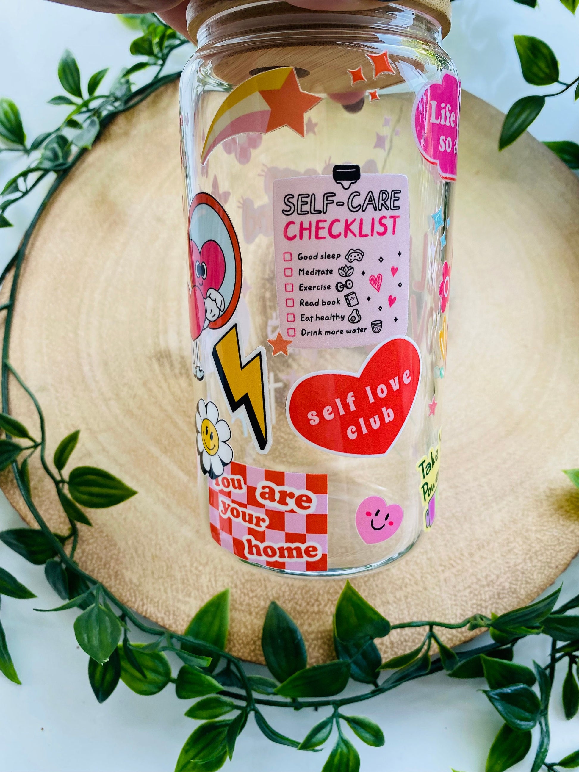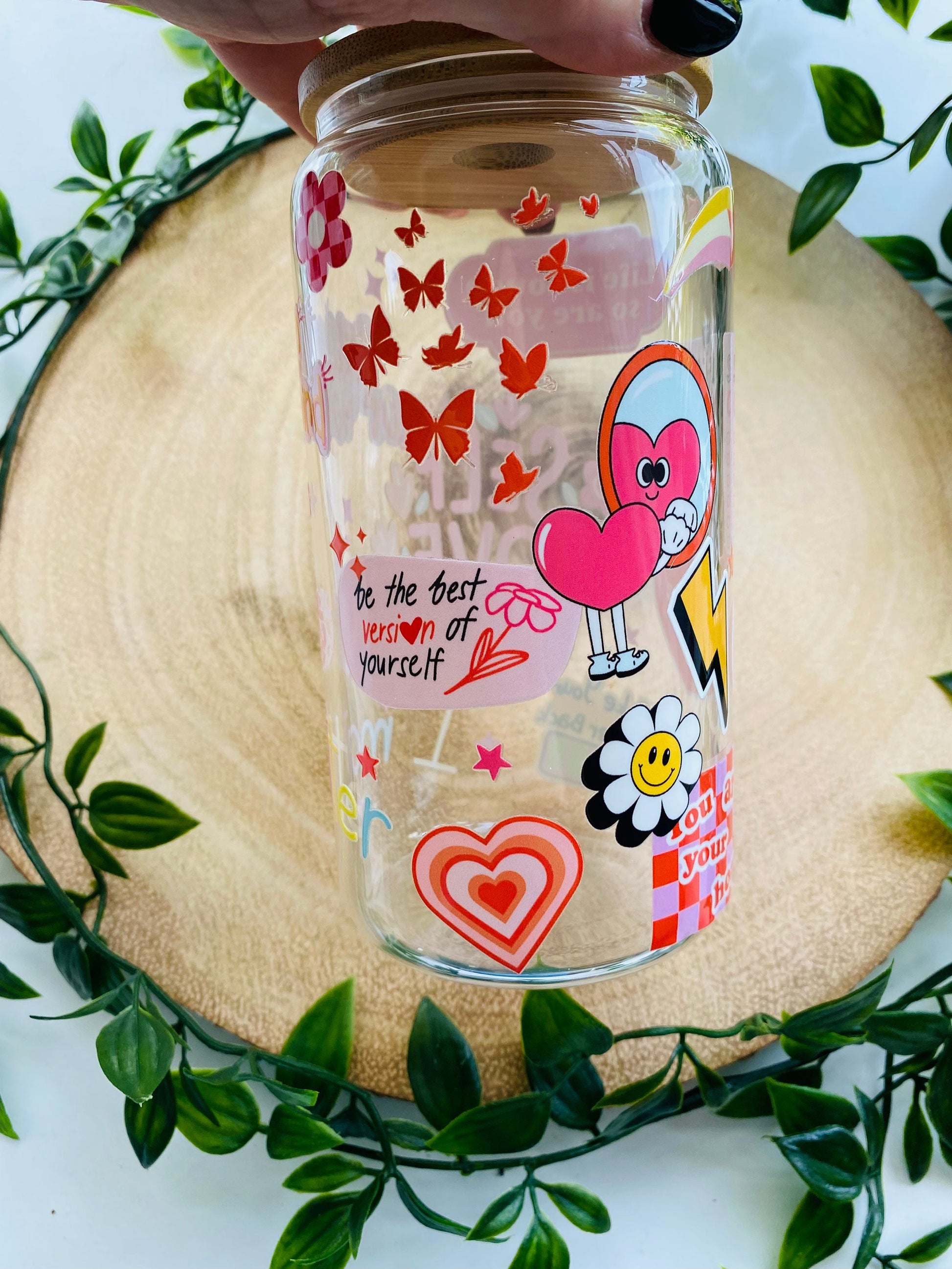 The Self Love glass cup is bright, uplifting, and full of positive energy, featuring colourful flowers, hearts, and empowering phrases like “Life is tough but so are you” and “Take your power back.” Perfect for sipping your favourite drink while giving yourself a daily boost of confidence.