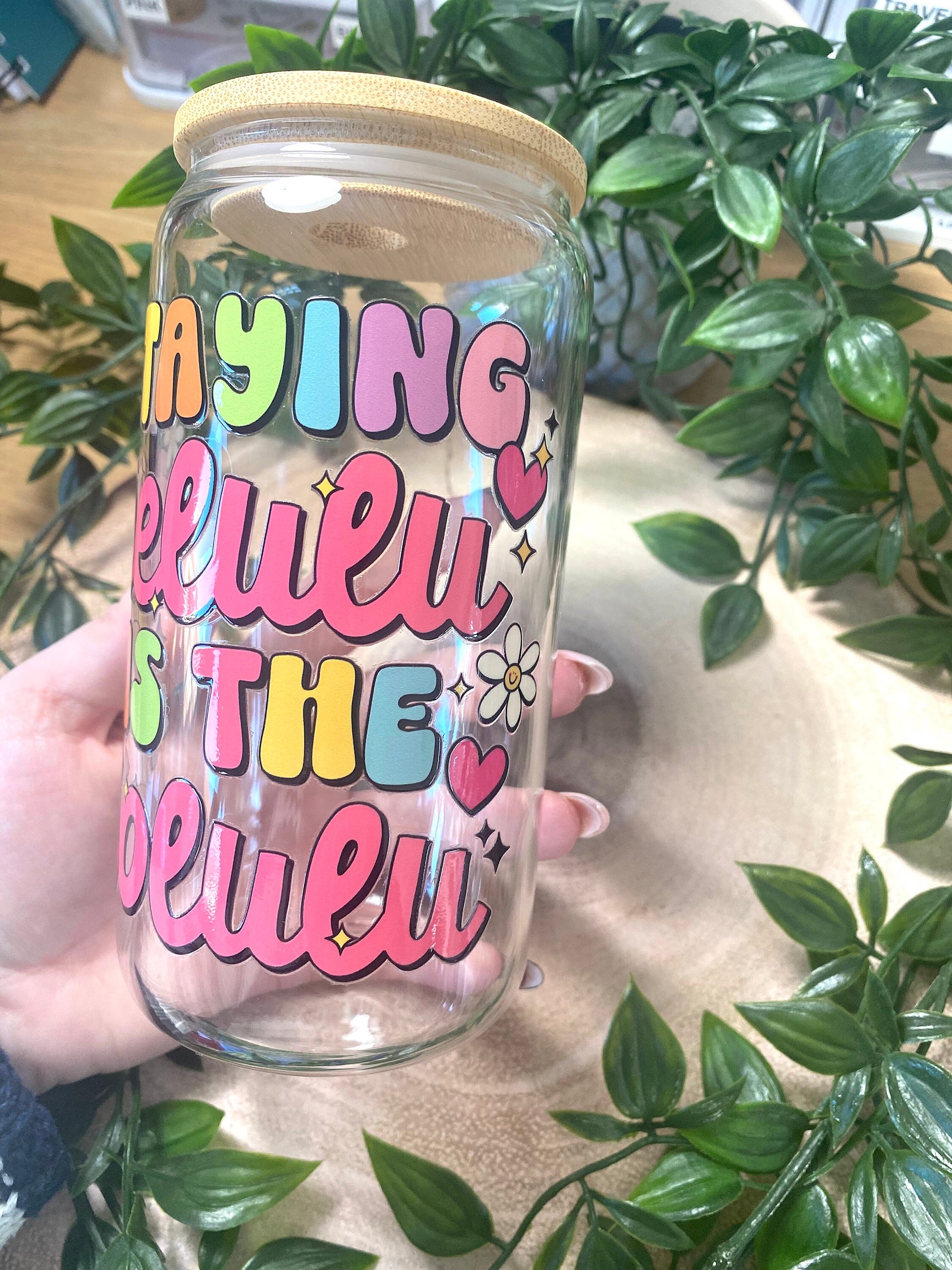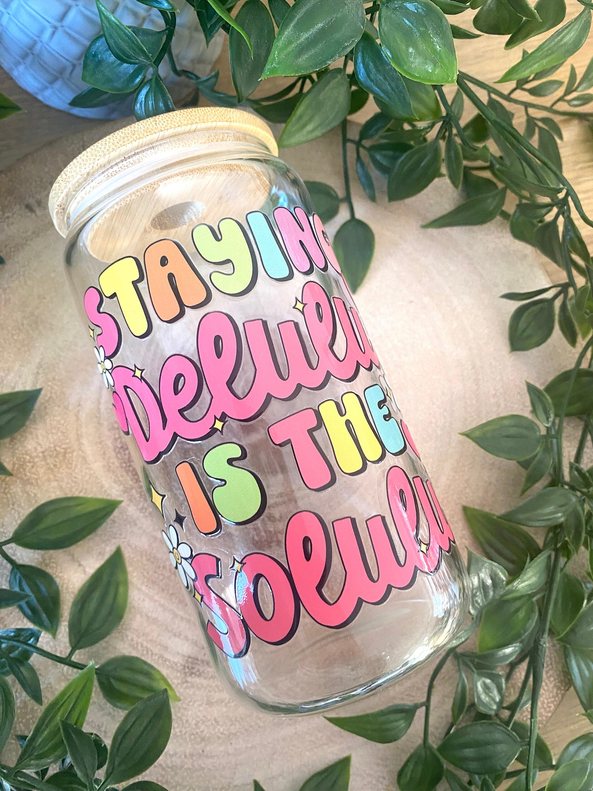 The Staying Delulu Is the Solulu Glass Cup is a playful, pastel-coloured reminder to embrace your fun side, featuring bold bubble letters and daisy accents for a touch of whimsy. Perfect for keeping your drinkware as entertaining as your outlook on life.