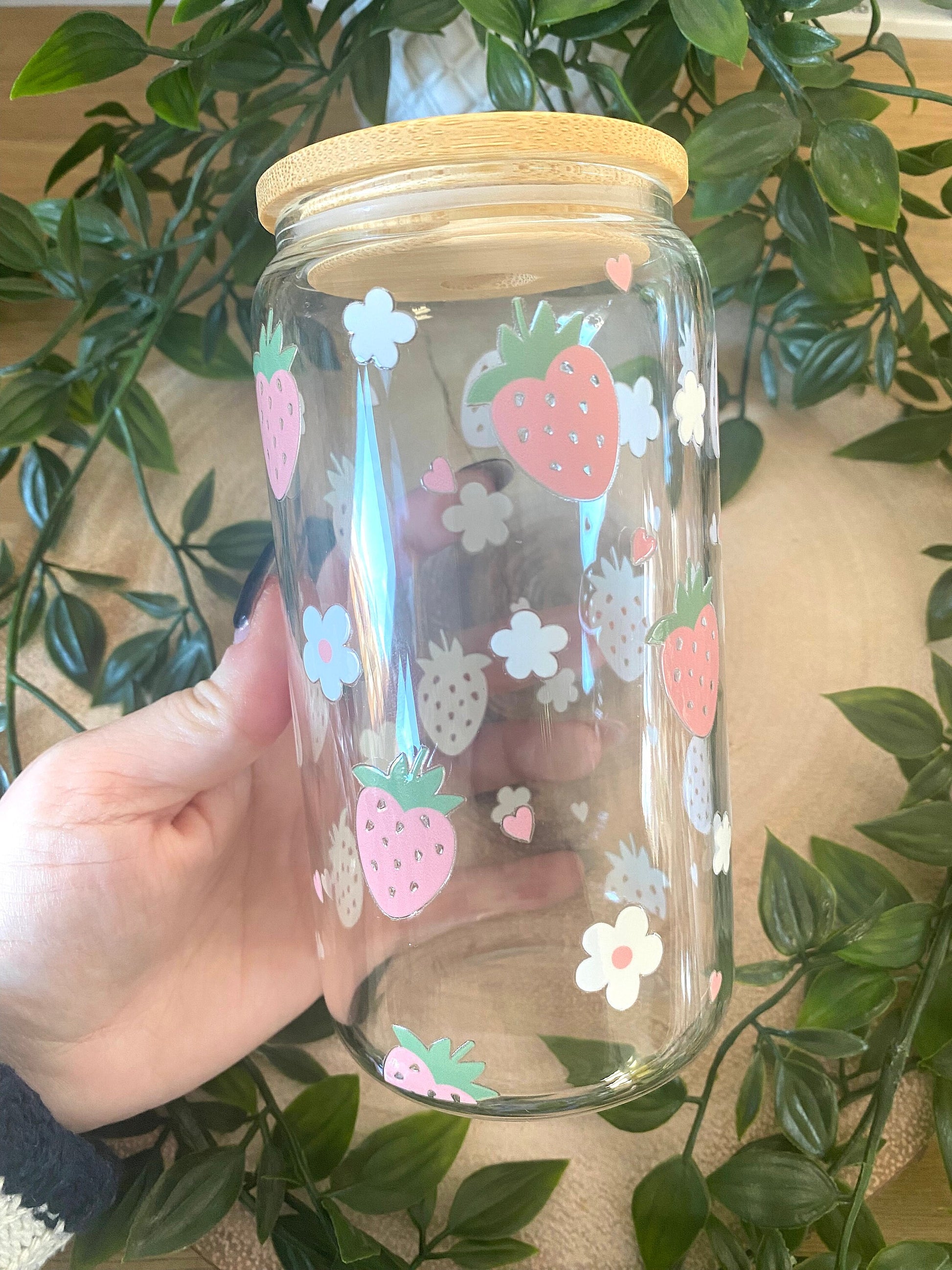 The Pastel Strawberries glass cup is as sweet as it looks, covered in soft pink and white strawberries with tiny hearts and flowers sprinkled throughout. A dreamy design that’s perfect for bringing a touch of fruity fun to your favorite drinks.