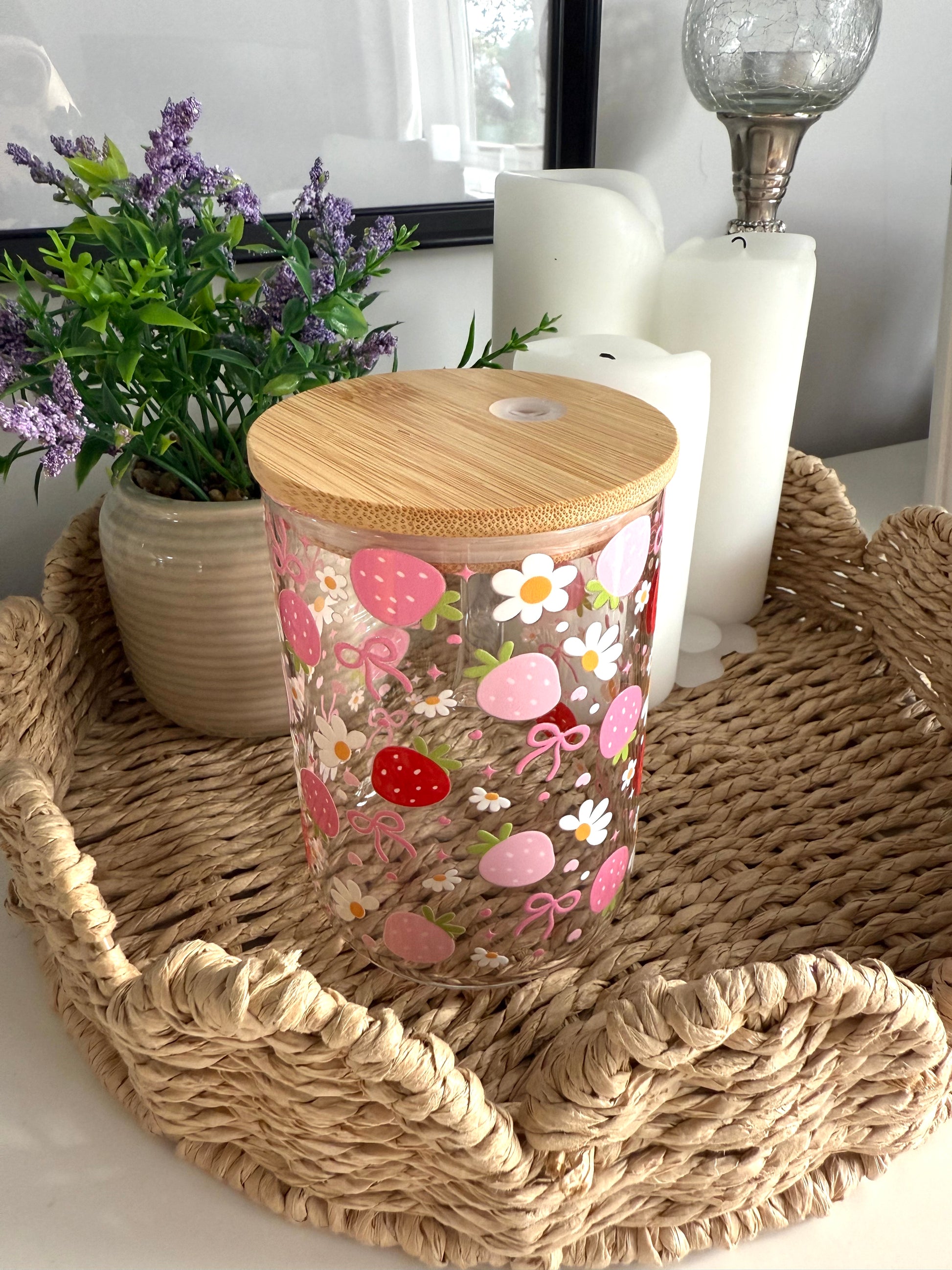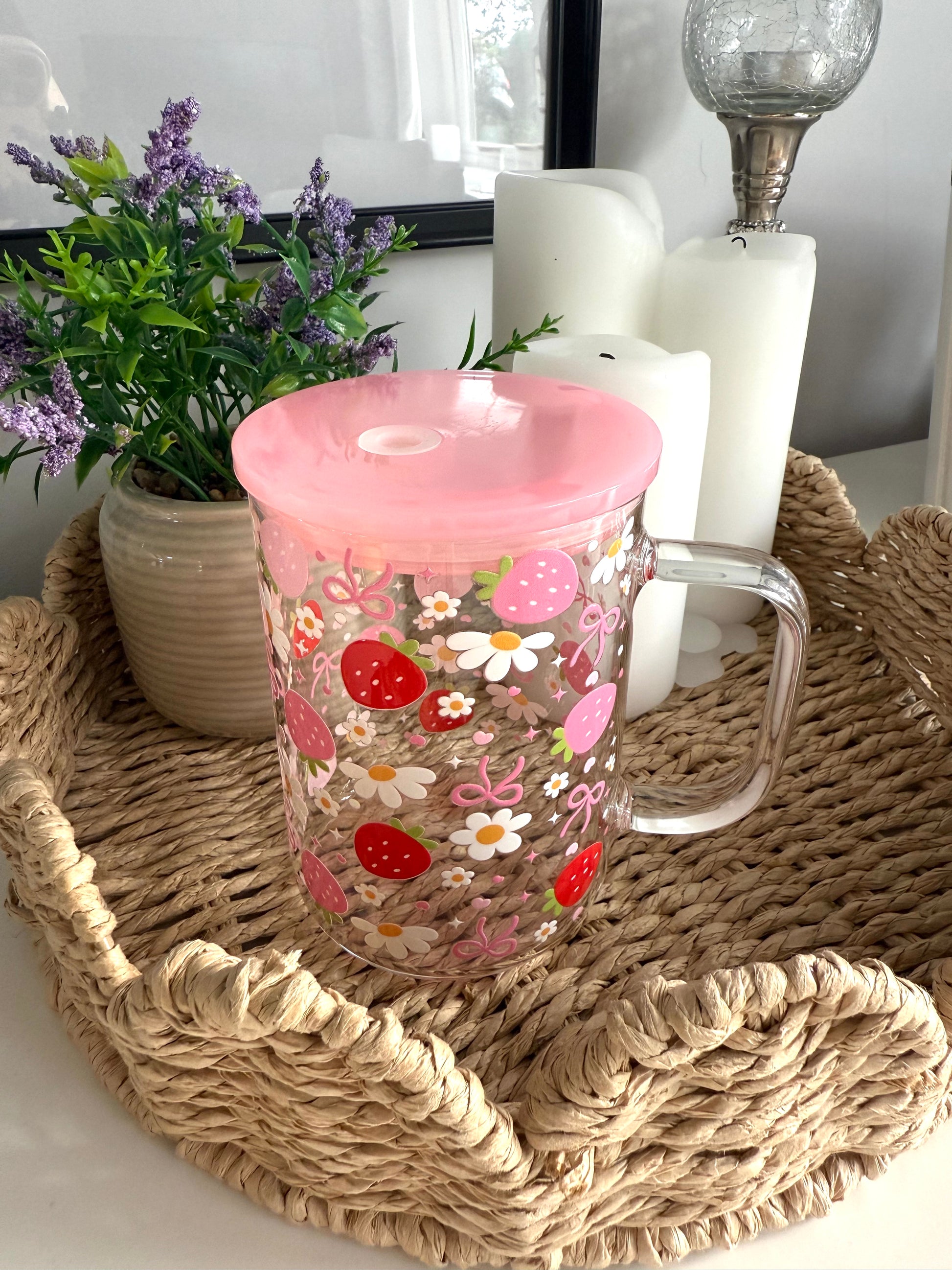The Strawberries & Daisies glass mug is sweet, fresh, and full of charm, featuring a delightful mix of pink and red strawberries, dainty white daisies, and cute bow details. Perfect for adding a touch of cottagecore sweetness to your favorite drinks.