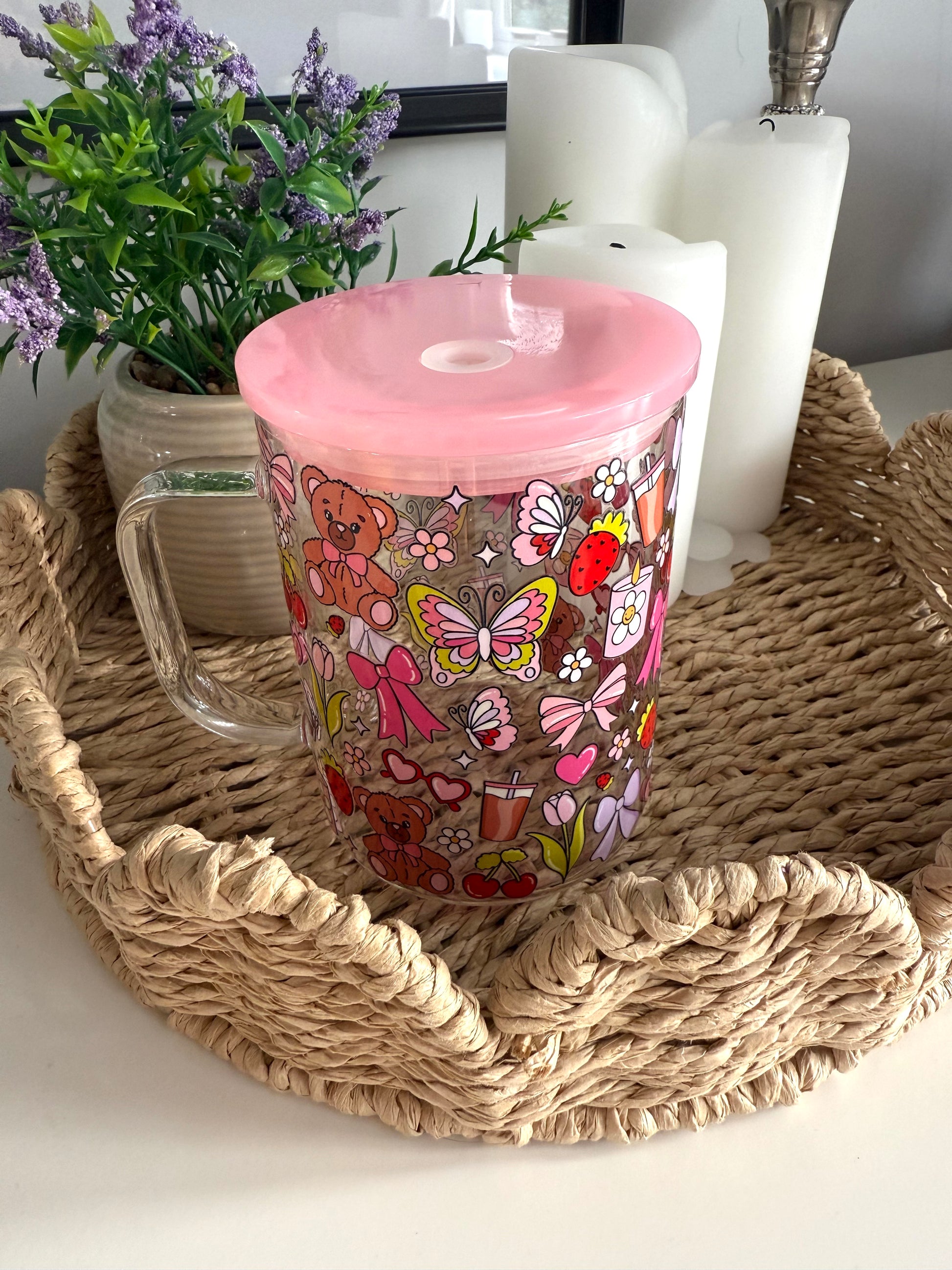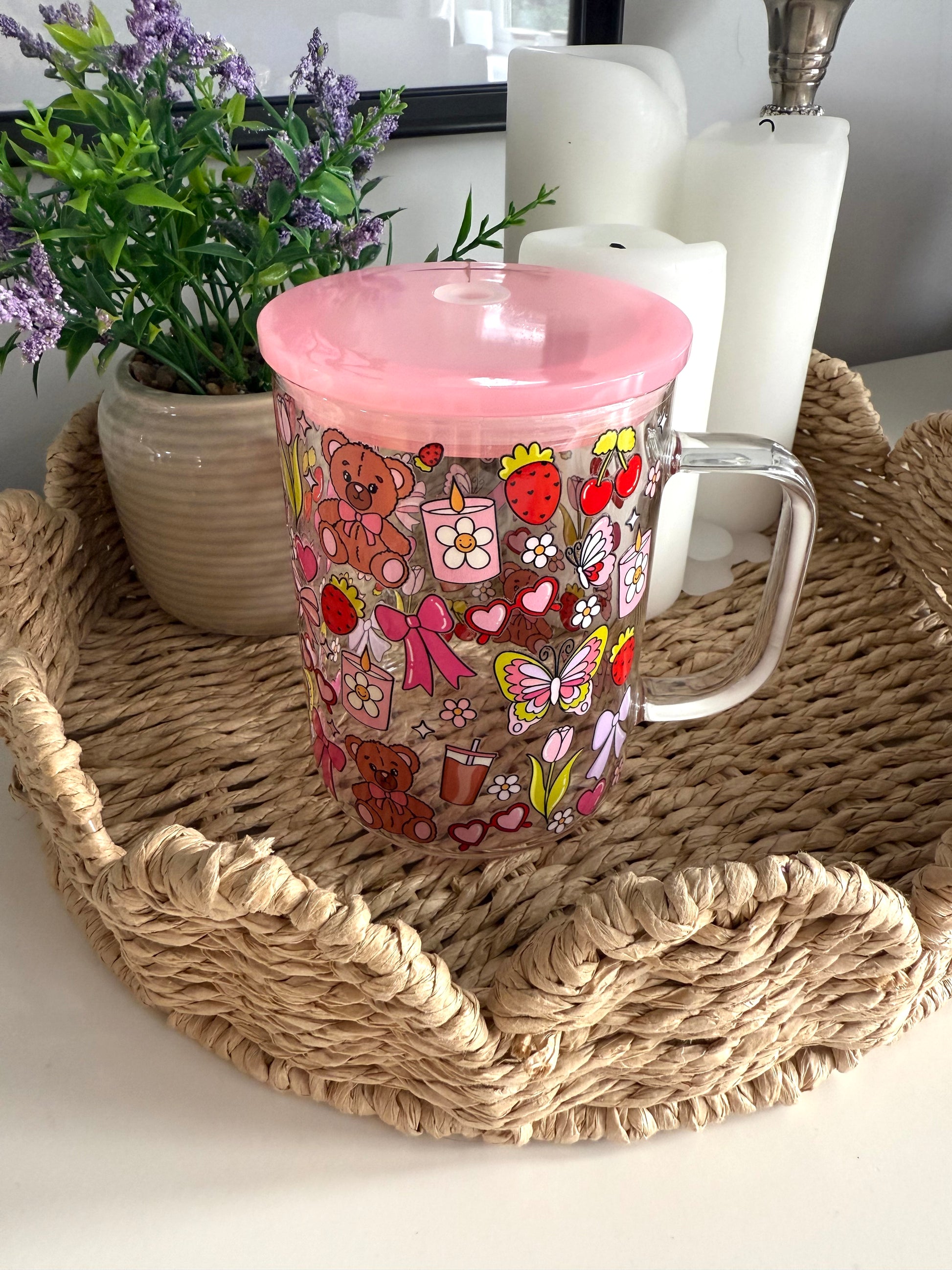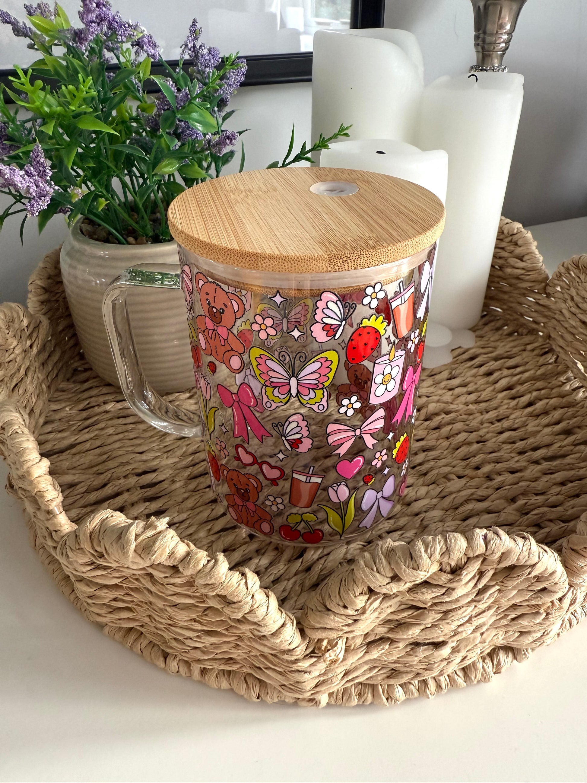 The Strawberry Daydream Glass Mug is bursting with charm, featuring a playful mix of hearts, bows, strawberries, butterflies, and iced coffee drinks in vibrant shades of pink and red. It’s the ultimate mix of cute and fun, perfect for adding a little sweetness to your daily sips.