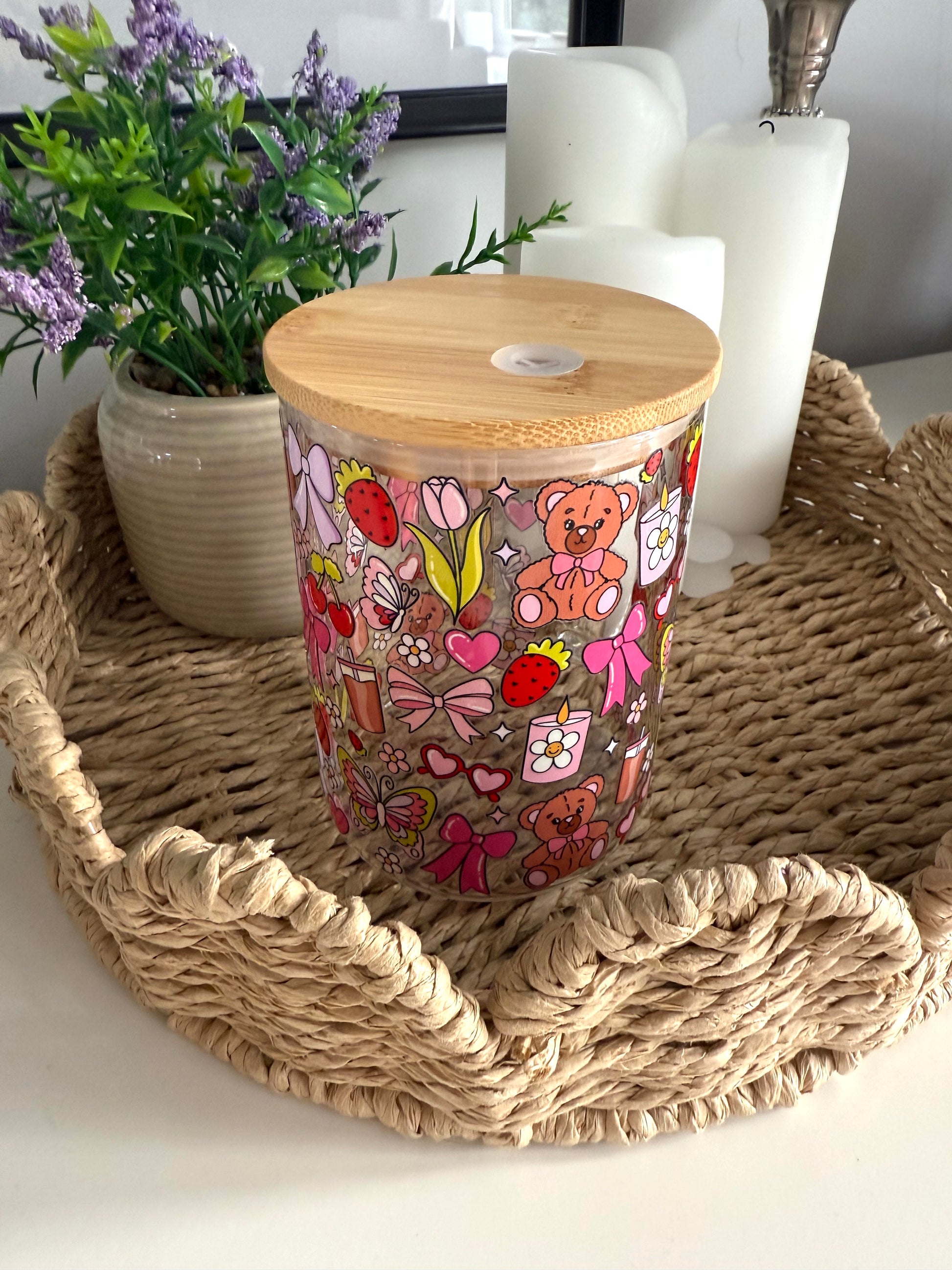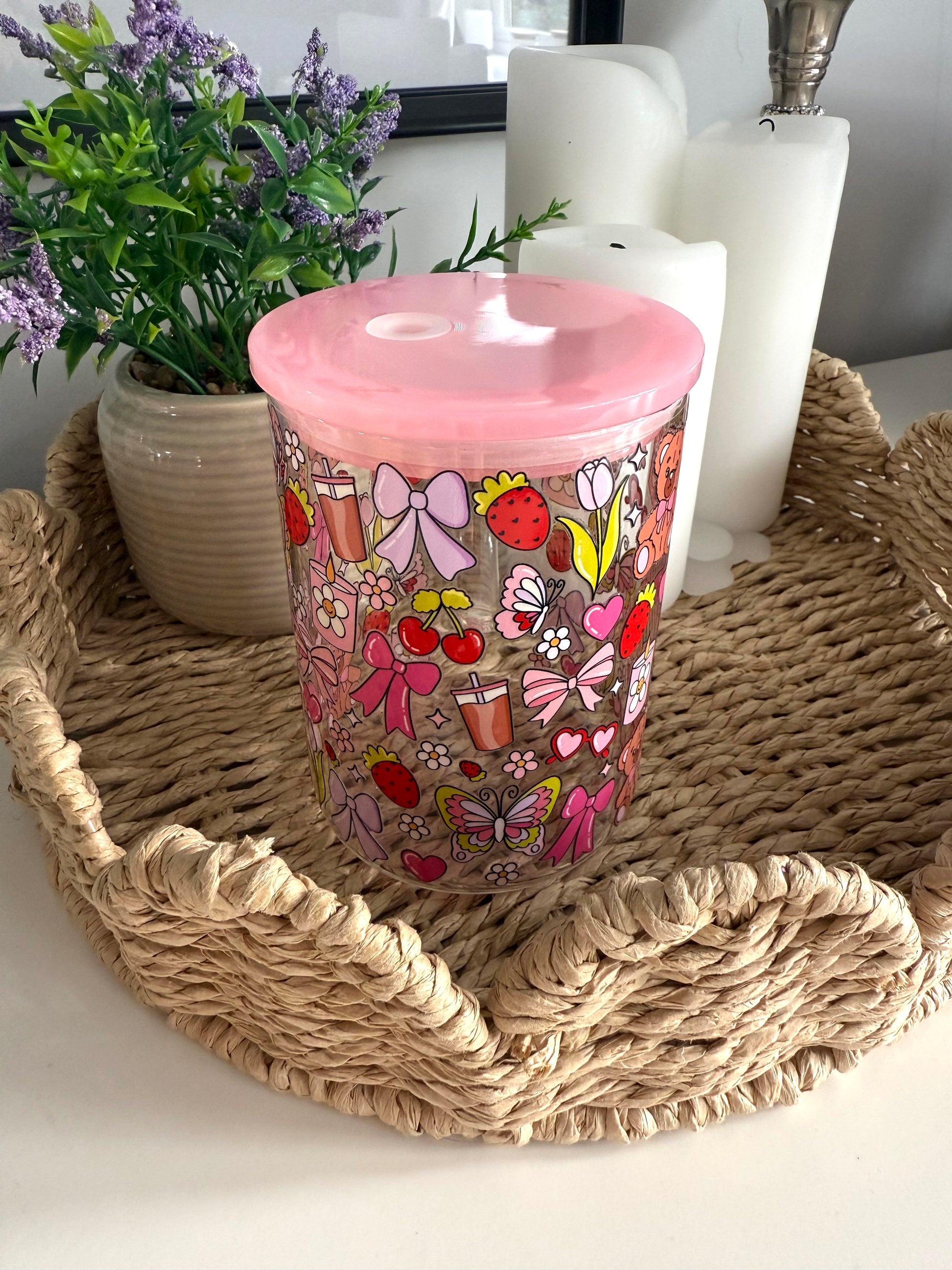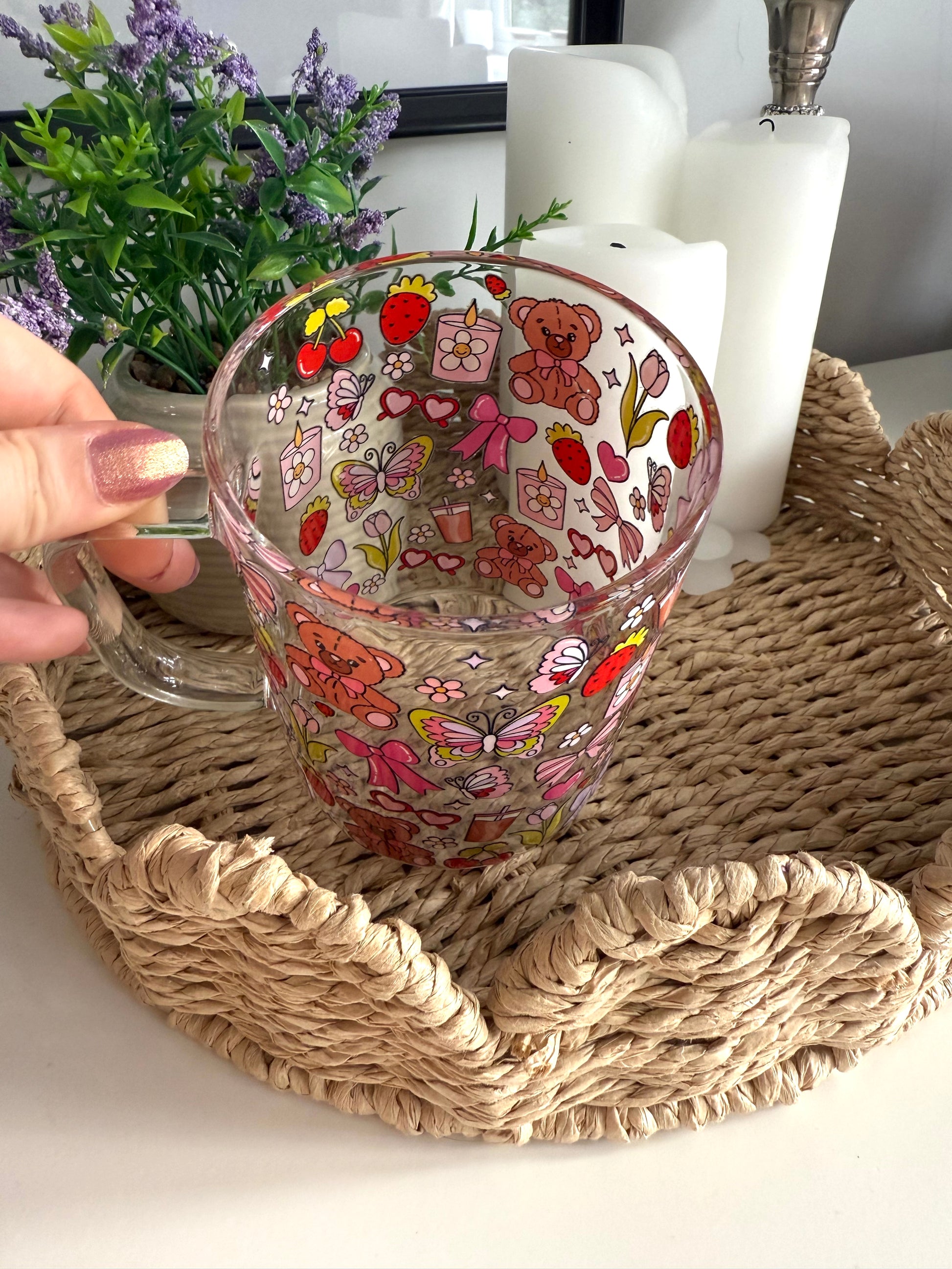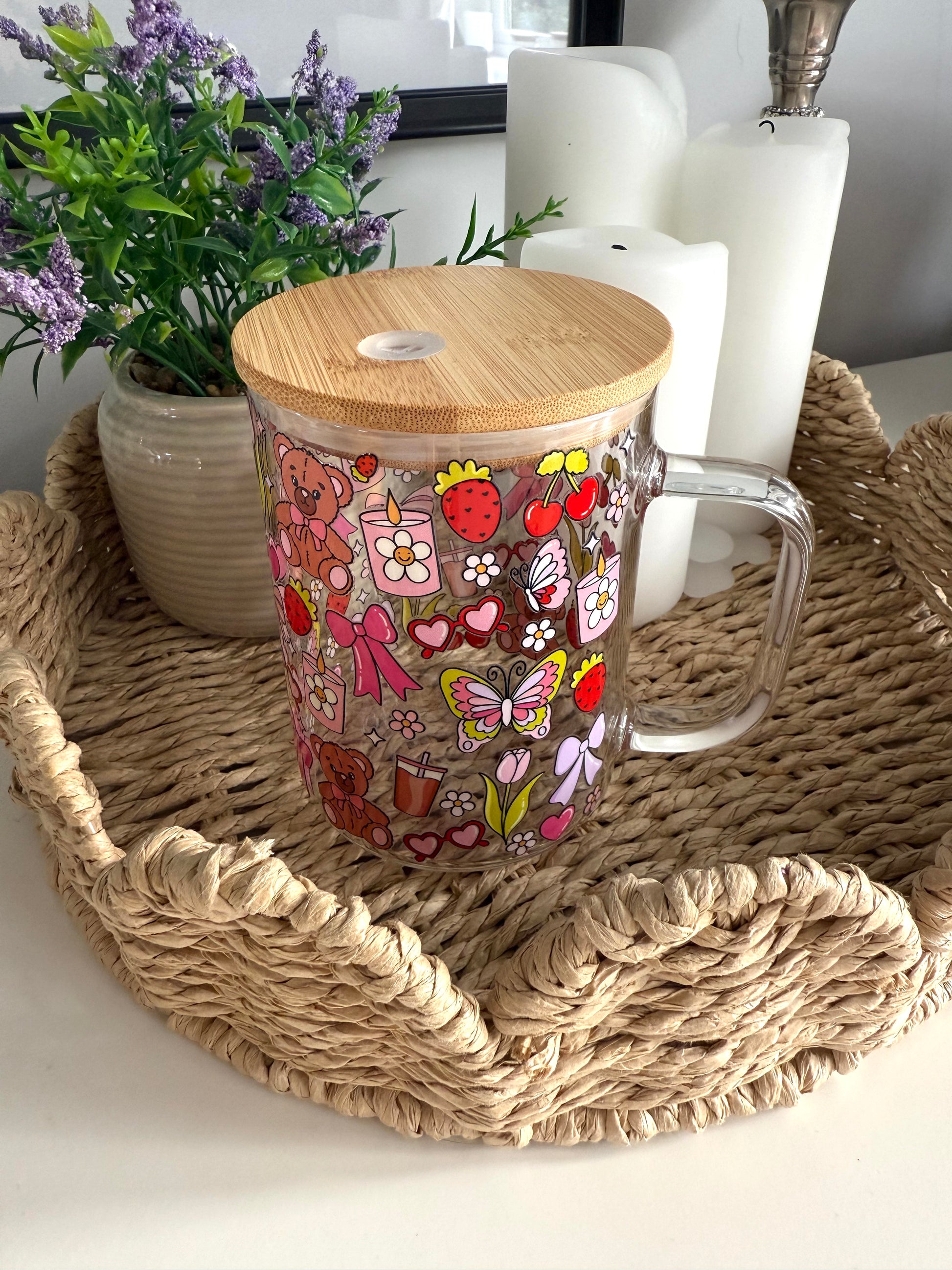 The Strawberry Daydream Glass Mug is bursting with charm, featuring a playful mix of hearts, bows, strawberries, butterflies, and iced coffee drinks in vibrant shades of pink and red. It’s the ultimate mix of cute and fun, perfect for adding a little sweetness to your daily sips.