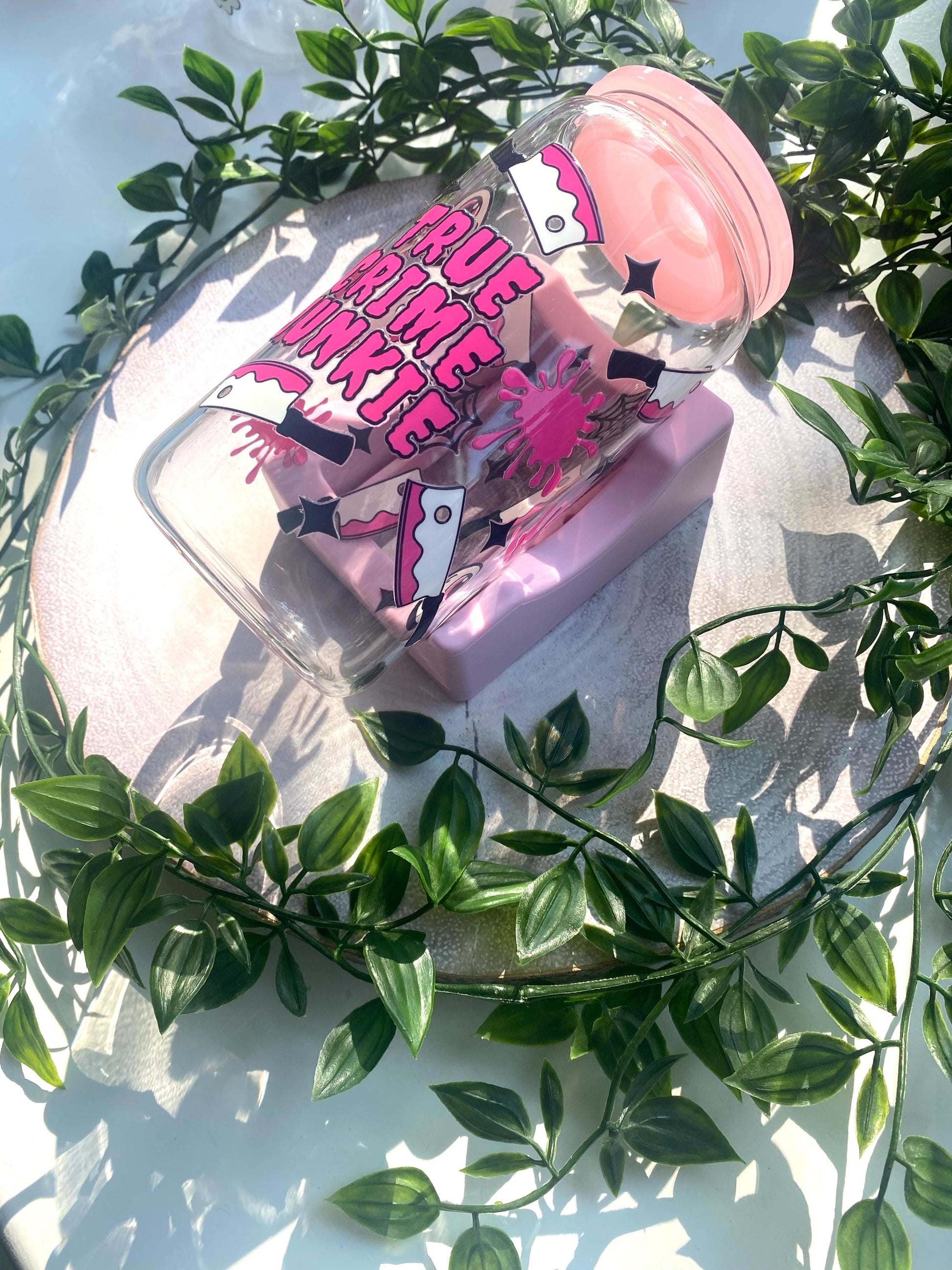 The True Crime Junkie glass cup is a bold and edgy statement piece, featuring hot pink retro lettering and razor blade graphics for those who love their drinks served with a side of mystery. Perfect for sipping your favourite beverage while binging podcasts, documentaries, or your latest whodunit.