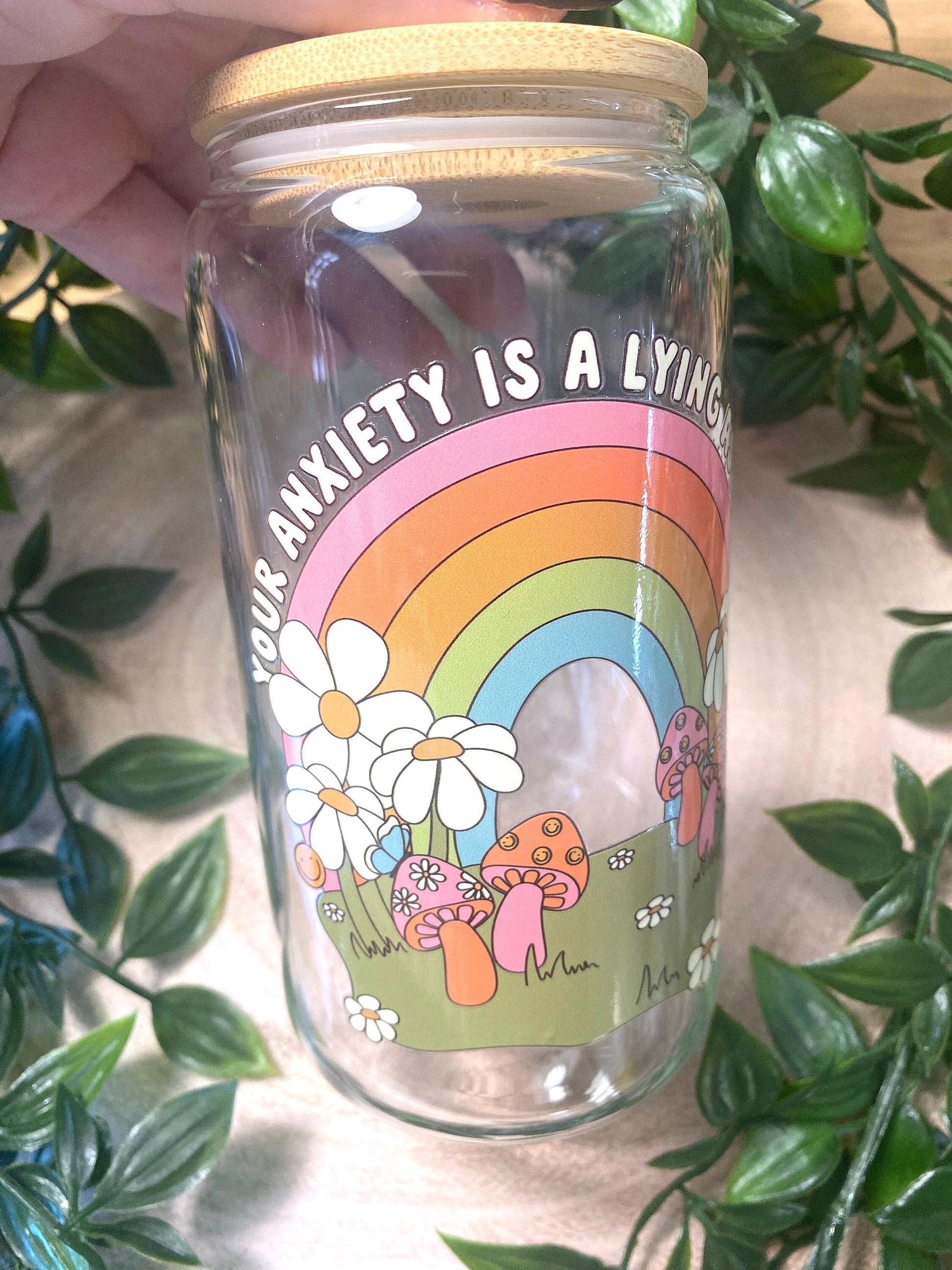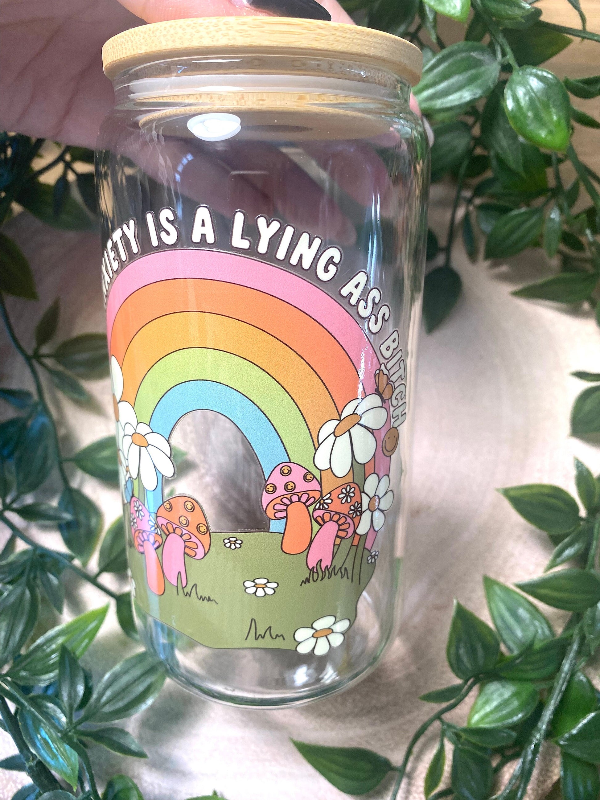 The Your Anxiety Is a Lying Ass Bitch Glass Cup is a colourful reminder to brighten your day, featuring a cheerful rainbow, daisies, and whimsical mushrooms for a dose of positivity with every sip. Perfect for adding encouragement to your daily coffee or tea ritual.